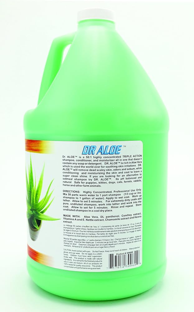 Dr. Aloe Shampoo is a 50:1 ultra high concentrate triple action shampoo conditioner and moisturizer all in one that doesn't contain any soap or detergent. Dr. Aloe is a prescription alternative shampoo that contains Aloe Vera, which is used the world over to control itching and soothing skin irritations. Dr. Aloe gently removes dead scaly skin, odors and sebum (oils), while conditioning and moisturizing the skin and coat to leave a super clean tangle free coat. Dr. Aloe is mild, pH balanced, natural, biodegradable and safe to use with flea control drops.