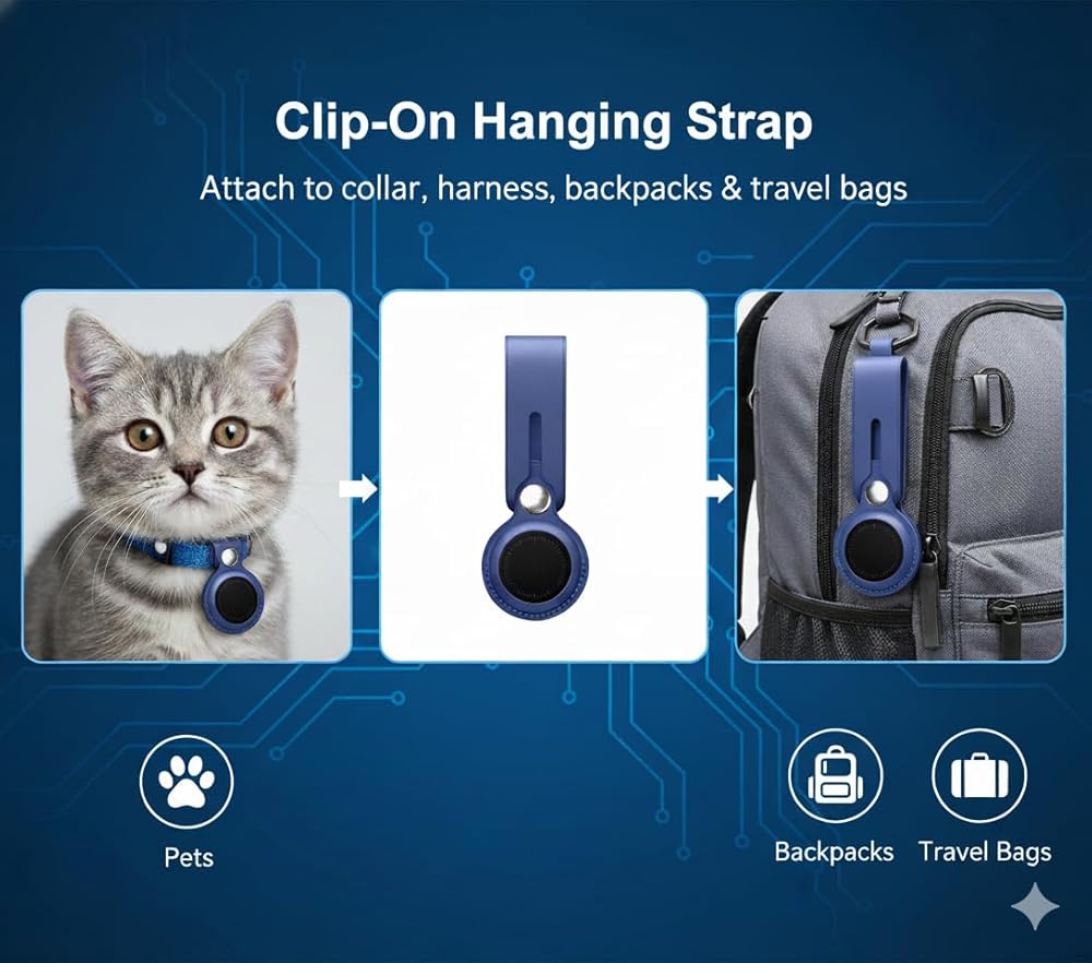 علامة موقع الحيوانات الأليفة بمشبك مع حامل - متوافقة مع Apple Find My (iOS فقط)، تصميم معلق مضاد للفقد، حافظة خفيفة الوزن ومقاومة للماء للقطط والأطواق والحقائب (أزرق)