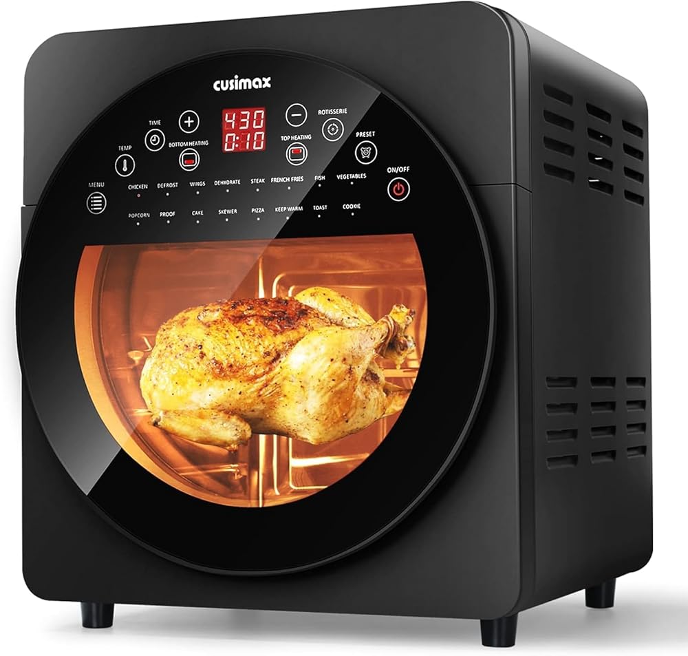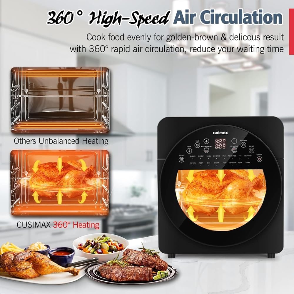 [تصميم آمن] - فرن محمصة الهواء المعتمد من ETL يتميز بنافذة شفافة وإضاءة داخلية، يسمح بفحص عملية الطبخ لضمان طعامك اللذيذ دون الإفراط في الطهي. تتسرب الحرارة والبخار من فتحات الهواء الموجودة على الجوانب، فلا داعي للقلق بشأن ارتفاع درجة حرارة خزائن المطبخ أو تعرضها للتلف.