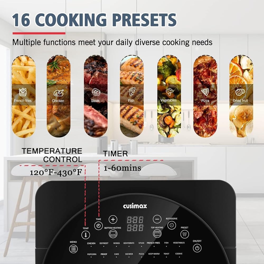 [أكثر من فرن مقلاة الهواء] - يمكن أن يعمل فرن المقلاة الهوائية هذا كفرن محمصة، أو مقلاة هوائية، أو مشواة، أو مجفف مع نطاق درجة حرارة واسع من 200 درجة فهرنهايت إلى 450 درجة فهرنهايت. اختر من بين 16 قائمة معدة مسبقًا للدجاج والخبز المحمص والبيتزا والمزيد - يمكنك تخصيص درجة الحرارة والوقت لإعداد طعامك اللذيذ بالطريقة التي تريدها تمامًا.