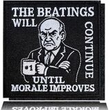 تصميم فريد وساخر: تتميز رقعة الروح المعنوية المطرزة هذه بشخصية صارمة متقاطعة الذراعين تحمل كوبًا "#1" أسفل العبارة الشهيرة: "سيستمر الضرب حتى تتحسن الروح المعنوية". تندمج الفكاهة الجافة والتسليم الجامد وأسلوب الرسم التوضيحي القديم في رقعة تلتقط بشكل مثالي منطق القيادة العنيد والكوميديا السوداء الكلاسيكية.