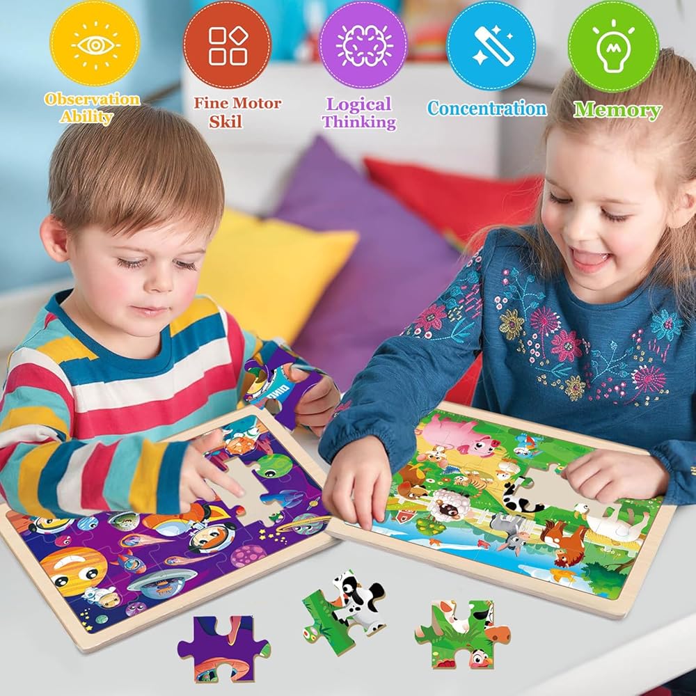 【فكرة هدية رائعة للأطفال】الألغاز الخشبية مناسبة للأطفال من سن 3 و4 و5 و6 سنوات للأولاد والبنات. تعتبر مجموعة ألغاز الأطفال خيارًا رائعًا لأعياد الميلاد وعيد الشكر والكريسماس وعيد الميلاد وعيد الفصح والهالوين وغيرها من العطلات. مع الألوان النابضة بالحياة والتصميمات الجميلة، سيحب الأطفال بالتأكيد ألغاز الصور المقطوعة هذه.