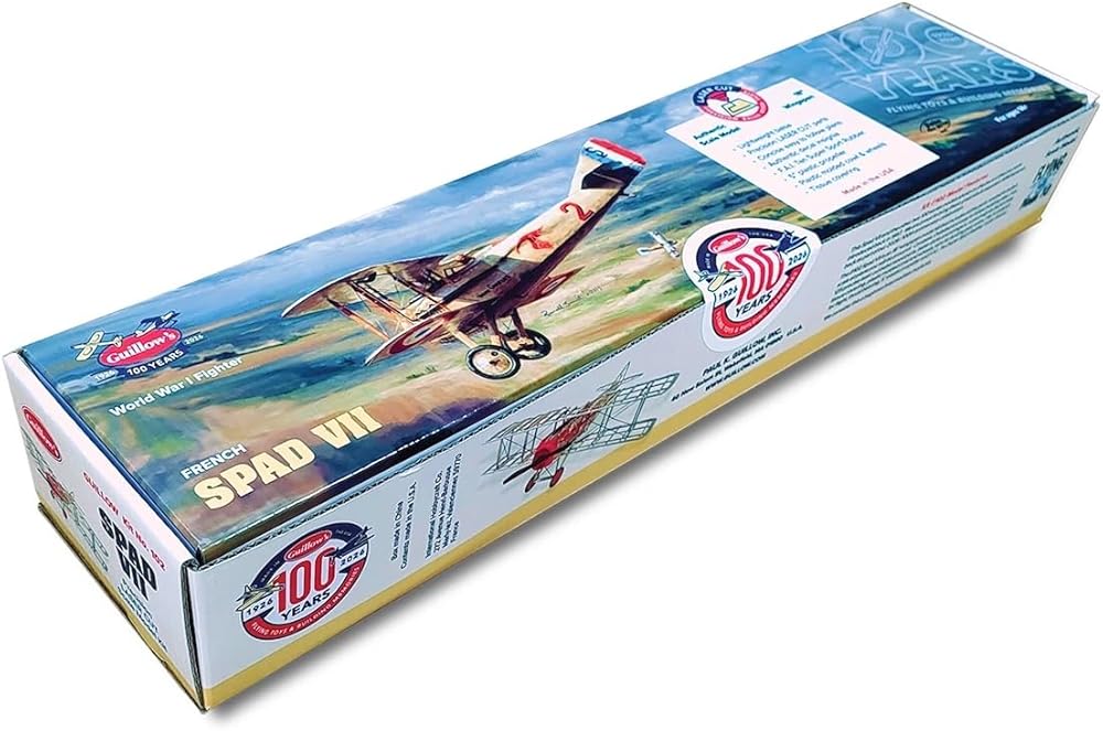 Wing Span: 18″ Authentic balsa wood 1/17 scale model. Beginner level kit. Approx build time: 20+ hours Description Introduced in 1916, the French SPAD VII was a robust and fast fighter aircraft that helped turn the tide of World War I aerial combat. Powered by a Hispano-Suiza engine, it was favored for its durability and firepower. Pilots like Georges Guynemer excelled in it, making the SPAD VII a key asset in Allied air superiority. Relive the thrilling era of World War I dog fights with Guillow's Kit #102 Spad VII! This meticulously crafted 1/19 scale balsa wood model features precision LASER-CUT balsa parts for a precise build experience. With a 18-inch wingspan, this kit includes everything you need—detailed building plans / instructions, scale WWI plastic wheels, a full set of decals, vacuum-formed plastic parts, a FAI Tan rubber power motor, propeller, and tissue covering—to create a great replica of the legendary biplane flown by French pilots. Perfect for hobbyists aged 14+, whether you're a detail-obsessed scale display builder or a free-flight enthusiast, this made-in-the-USA kit offers hours of hands-on enjoyment in its building and flying. Model kit includes all the parts you need to construct the plane, but you will need some building supplies for this hobby of balsa model aircraft construction: A flat pinnable surface (such as pc of thick cardboard or cork sheet, some pins to hold parts while building, razor blade or hobby knife, sandpaper, glue, paint and paintbrush are not included in the kit.