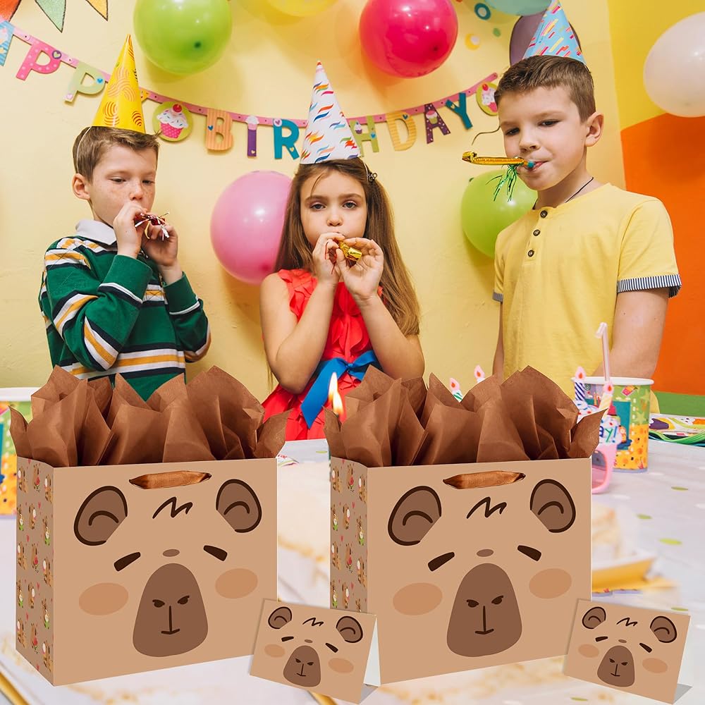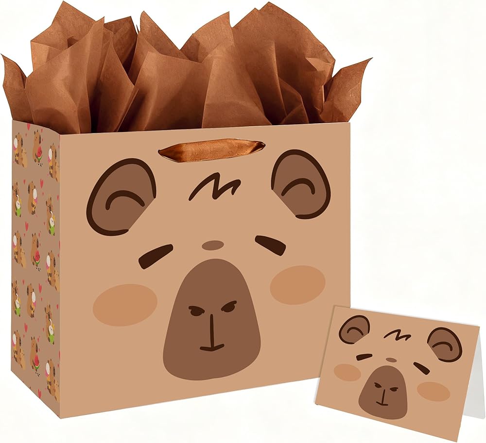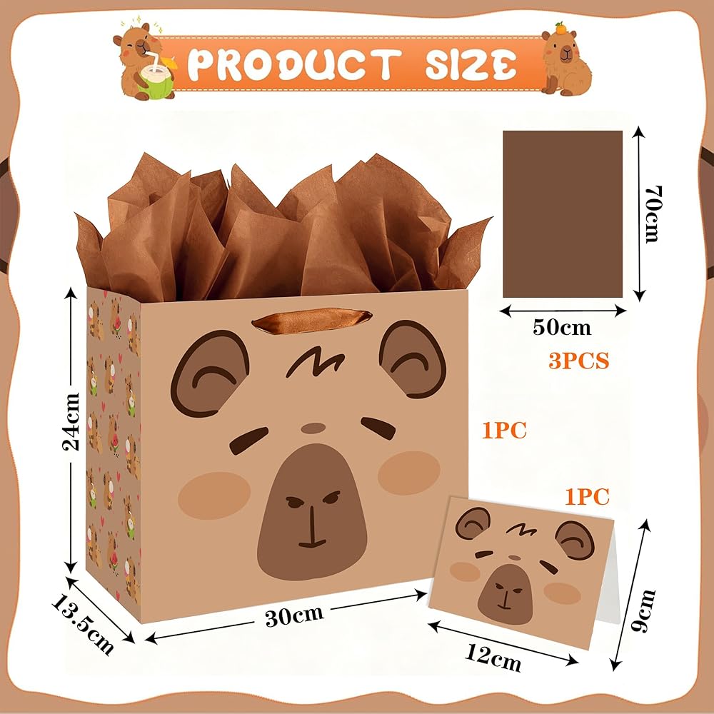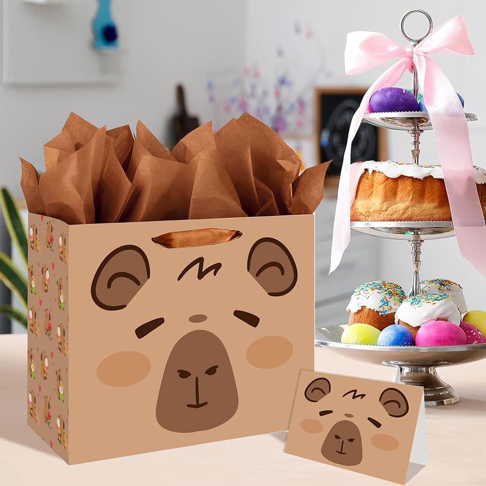 COMPLETE SET: Includes a brown Capybara-themed gift bag, coordinating tissue paper, and a matching greeting card for the perfect gift presentation