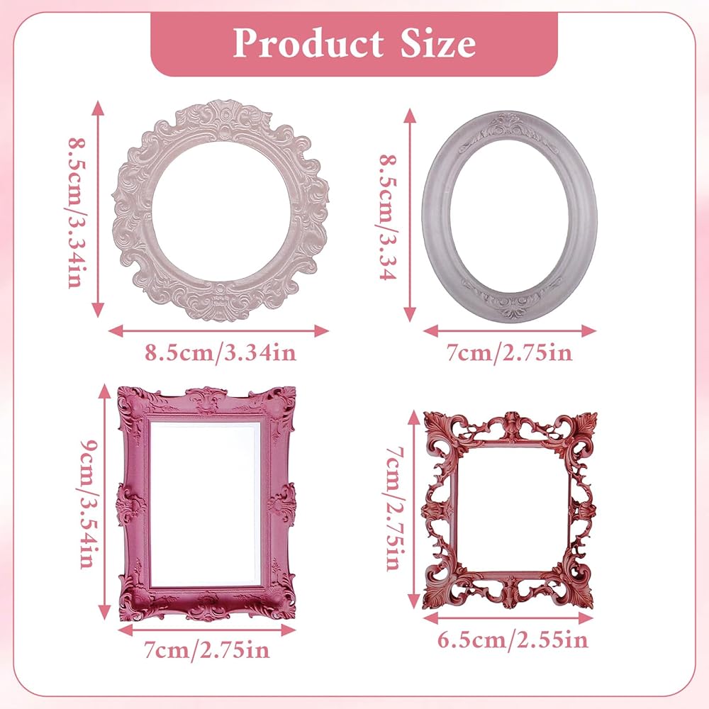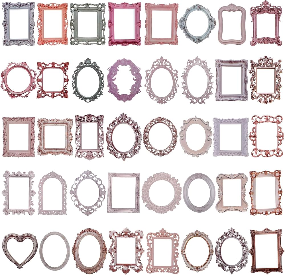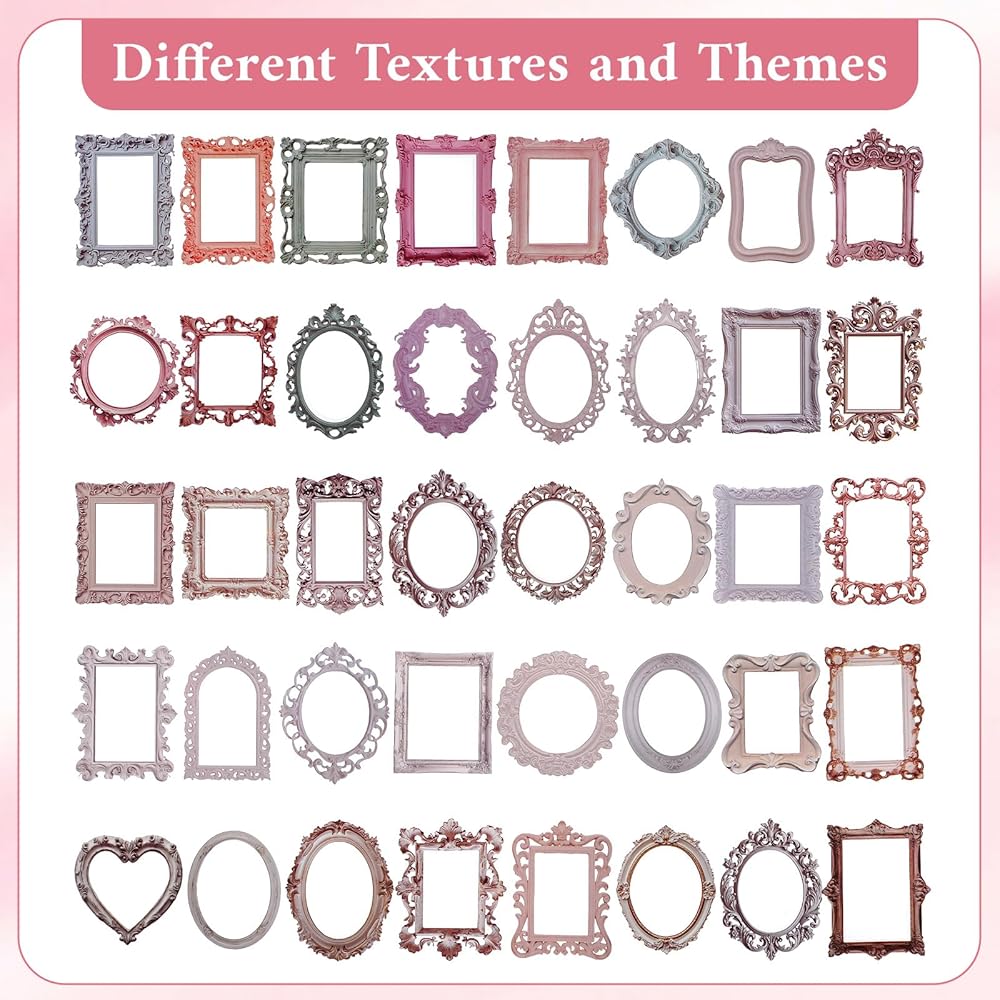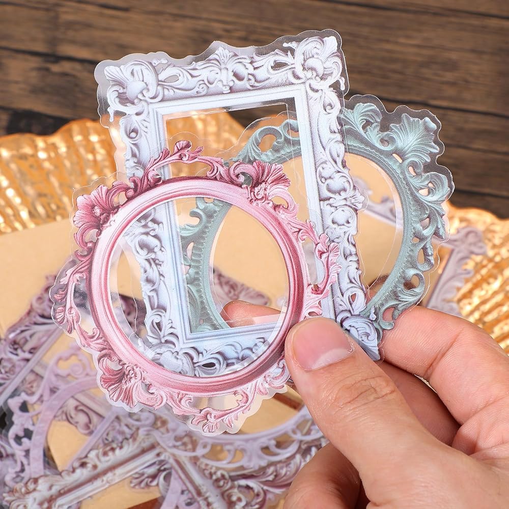 【Complete Packaging Contents】Includes 40 pcs of vintage frame stickers organized in four distinct design themes: Baroque Dream, Foggy Past, Fading Memories, and Gilded Years, with 10 stickers per theme. Each sticker measures approximately 5.5-7.5cm in width and 7-9cm in length.