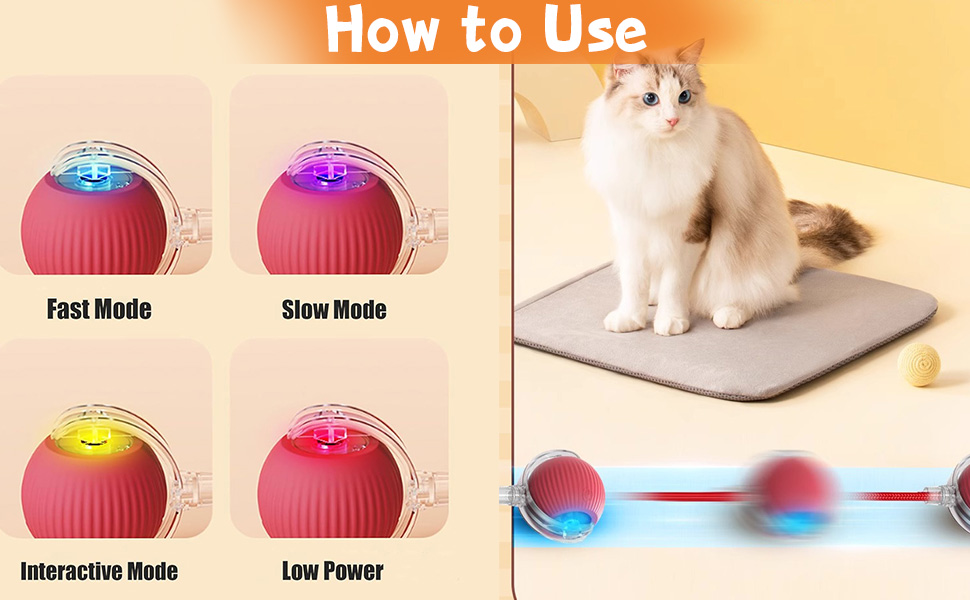 3 أوضاع ممتعة: الوضع السريع (الضوء الأزرق) - مثالي للسجاد أو الحيوانات الأليفة ذات الطاقة العالية؛ الوضع البطيء (الضوء الأرجواني) - مثالي للتدحرج السلس على الأرضيات الصلبة؛ الوضع التفاعلي (الضوء الأصفر) – تتحرك الكرة فقط عندما يتفاعل حيوانك الأليف معها، مما يشجع على المشاركة النشطة.