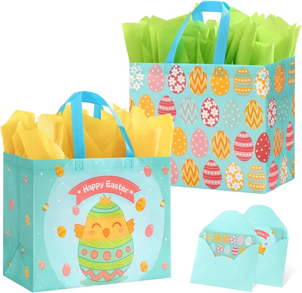2 حزمة من أكياس هدايا عيد الفصح الكبيرة مقاس 33 سم من ستيبوب مع مناديل ورقية، أكياس عيد الفصح غير المنسوجة قابلة لإعادة الاستخدام مع مقابض لصيد البيض للأطفال/مستلزمات الحفلات، 12.8 سم × 10.2 سم × 6.3 سم