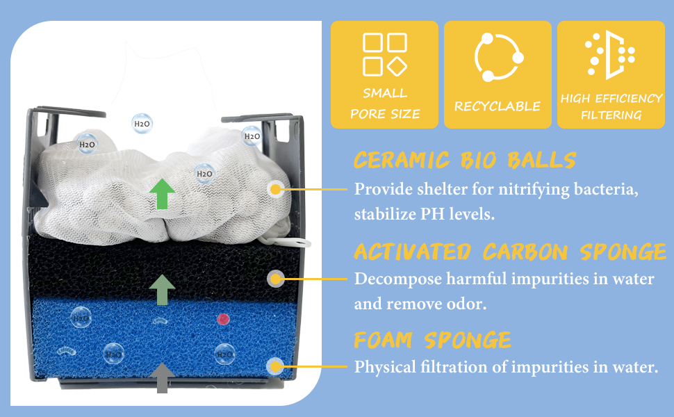 • وسائد فلتر كربون مطورة 2 في 1: يمكن للهيكل المسامي الشبكي ثلاثي الأبعاد لإسفنجة الكربون المنشط أن يقوم بتصفية شوائب الجسيمات الكبيرة مثل سماد الأسماك والطعم المتبقي، بالإضافة إلى امتصاص الملوثات القابلة للذوبان من خلال الكربون المنشط. وهي أكثر مسامية من الطبقة المكدسة من الكربون المنشط الحبيبي، مما يجعل توزيع تدفق المياه أكثر اتساقًا.