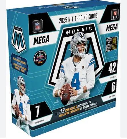 2025 بطاقات تداول Mosaic Football Mega Box، 7 بطاقات في كل عبوة، 6 عبوات في كل صندوق، إجمالي 42 بطاقة. 13 متوازيًا في كل صندوق