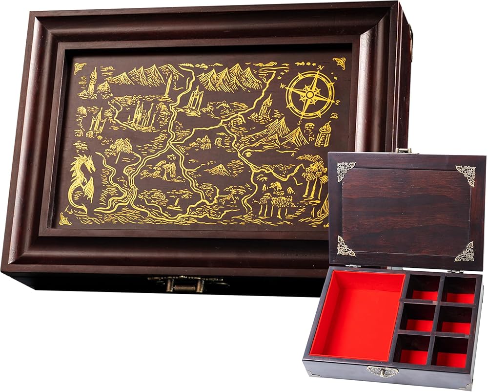 • جمالية كلاسيكية كلاسيكية: يستحضر مظهر قطعة أثرية من العالم القديم، هذا الصندوق الخشبي مصنوع من خشب الصنوبر الصلب الأصلي مع لمسة نهائية غنية داكنة، ومزيَّن باختيارك من تصميمين ذهبيين: تنين D20 المخيف أو خريطة الخيال القديمة. يتميز الجزء الداخلي بقاعدة مخملية لصخور الرياضيات الخاصة بك والتي تحمي الراتنج ذو الحواف الحادة أو النرد المعدني الثقيل من الخدوش وتخفف من هبوط كل لفة داخل قبو الطاولة الكلاسيكي هذا.