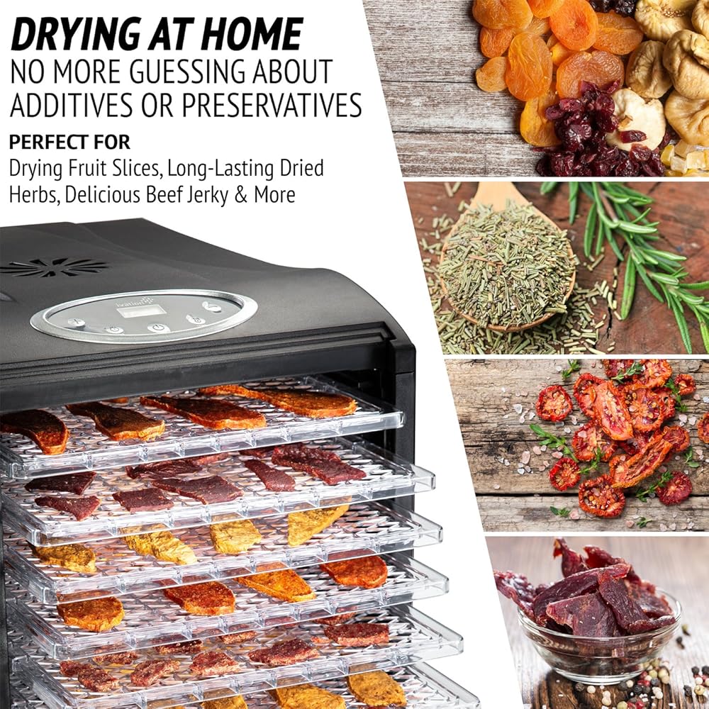 6 رفوف تجفيف واسعة (13 × 12 بوصة) قابلة للتعديل تستوعب مجموعة واسعة من الفواكه والأعشاب والخضروات واللحوم، رائعة للعائلات الكبيرة والبستانيين والرياضيين والهواة في الهواء الطلق والمتحمسين المهتمين بالصحة