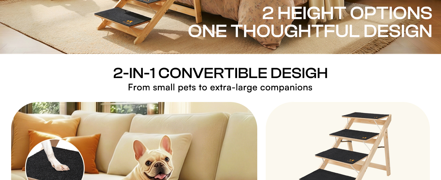 تصميم قوي وآمن 2 في 1: مصنوع من الخشب الصلب مع قاعدة ملصقات مضادة للانزلاق لتحقيق أقصى قدر من الثبات، تمنع سلالم الحيوانات الأليفة هذه الانقلاب بينما تتميز بخطوات عالية الاحتكاك من أجل قدم آمن. ويمكن أيضًا تحويله بسرعة إلى منحدر، مما يجعل التسلق سهلاً، ويقلل الضغط على الوركين والمفاصل.