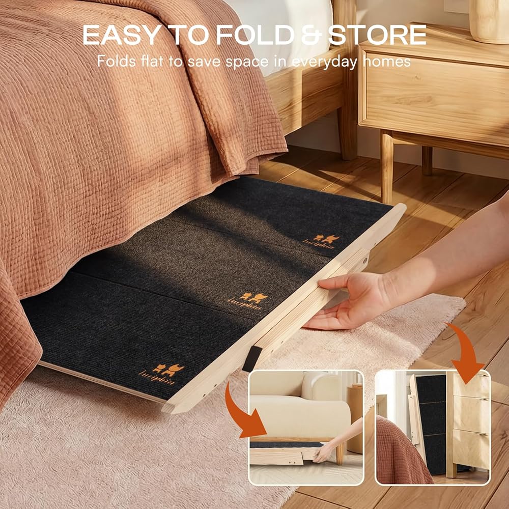 تصميم قابل للطي: يمكن فتح خطوات الكلب هذه واستخدامها دون تركيب على الإطلاق. عند عدم الاستخدام، يمكنك طيها بسهولة ووضعها تحت السرير أو في صندوق السيارة أو الزوايا الأخرى. الجزء الخلفي من السلم مجهز بإبزيم أمان، لذلك لا داعي للقلق بشأن الارتخاء الناتج عن تأثير قفز حيوانك الأليف.