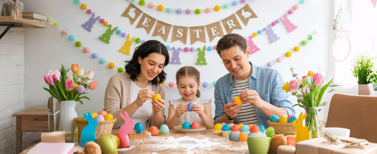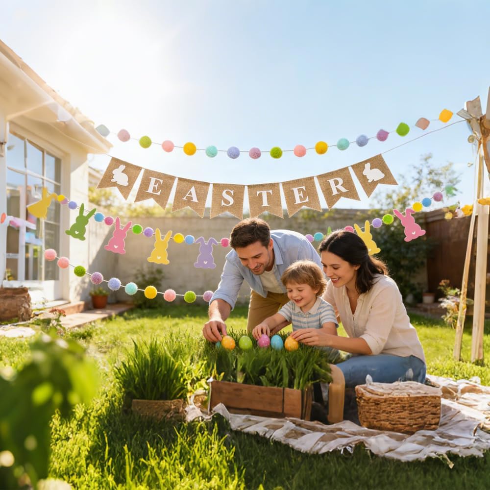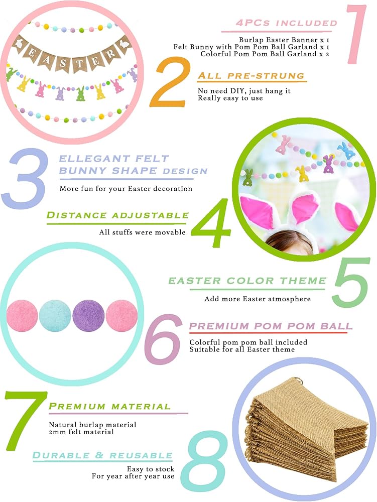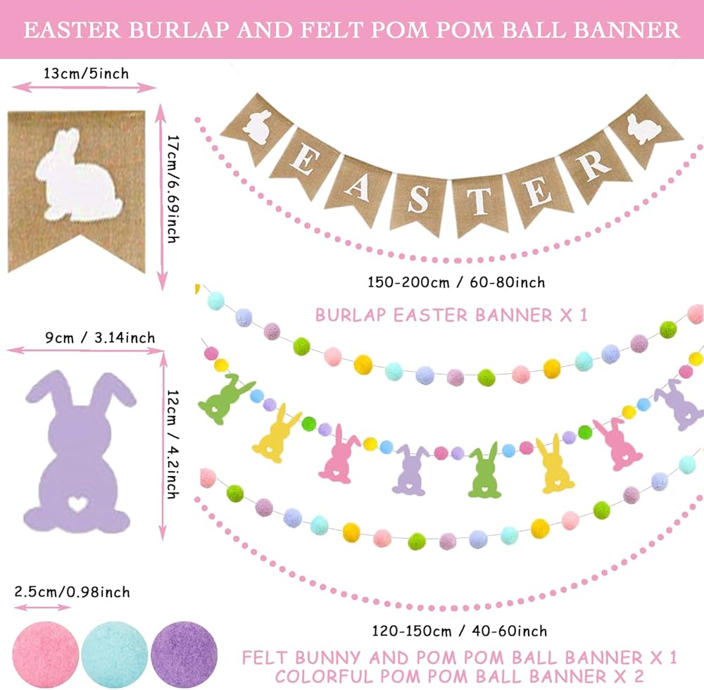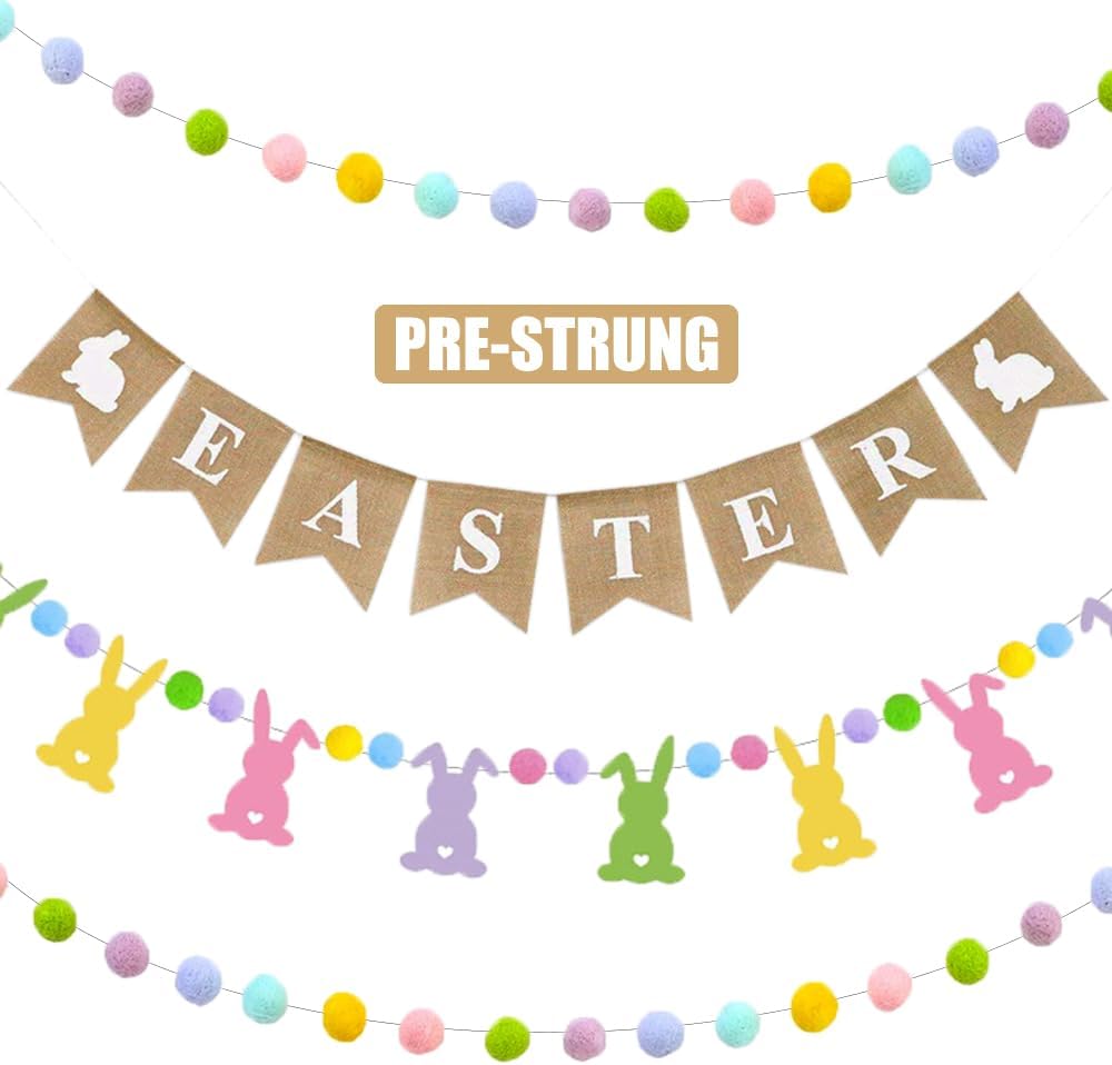 تصميم فريد - ارفع احتفالات عيد الفصح الخاصة بك مع مجموعة الديكور الجذابة المكونة من 4 قطع! يتميز بلافتة خيش "عيد الفصح" المبهجة مزينة بأرنب رائع، هذا الديكور يجلب روح عيد الفصح المبهجة إلى أي مساحة. إكليل الأرنب اللباد النابض بالحياة، المزين بكرات بوم بوم الساحرة، يضيف لمسة من الألوان للأطفال والكبار أيضًا. يعزز إكليل كرة بوم بوم الملون المكون من قطعتين الأجواء الاحتفالية. إنه لا يضيء منزلك فحسب، بل يخلق أيضًا جوًا دافئًا وجذابًا.