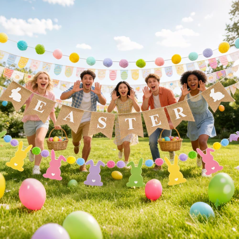 راية عيد الفصح، 4 قطع من رايات الخيش الطبيعي لعيد الفصح وأرنب لطيف مع كرة بوم بوم ملونة على شكل إكليل صور دعائم لحفلات الربيع ديكور معلق للمنزل والمكتب والفصول الدراسية