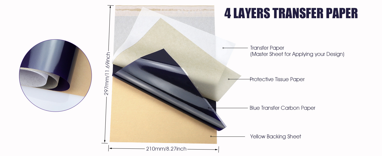 محتويات العبوة: 100 ورقة من ورق نقل الوشم بحجم A4 مع هيكل من 4 طبقات وثقب خط منقط لسهولة الفصل.