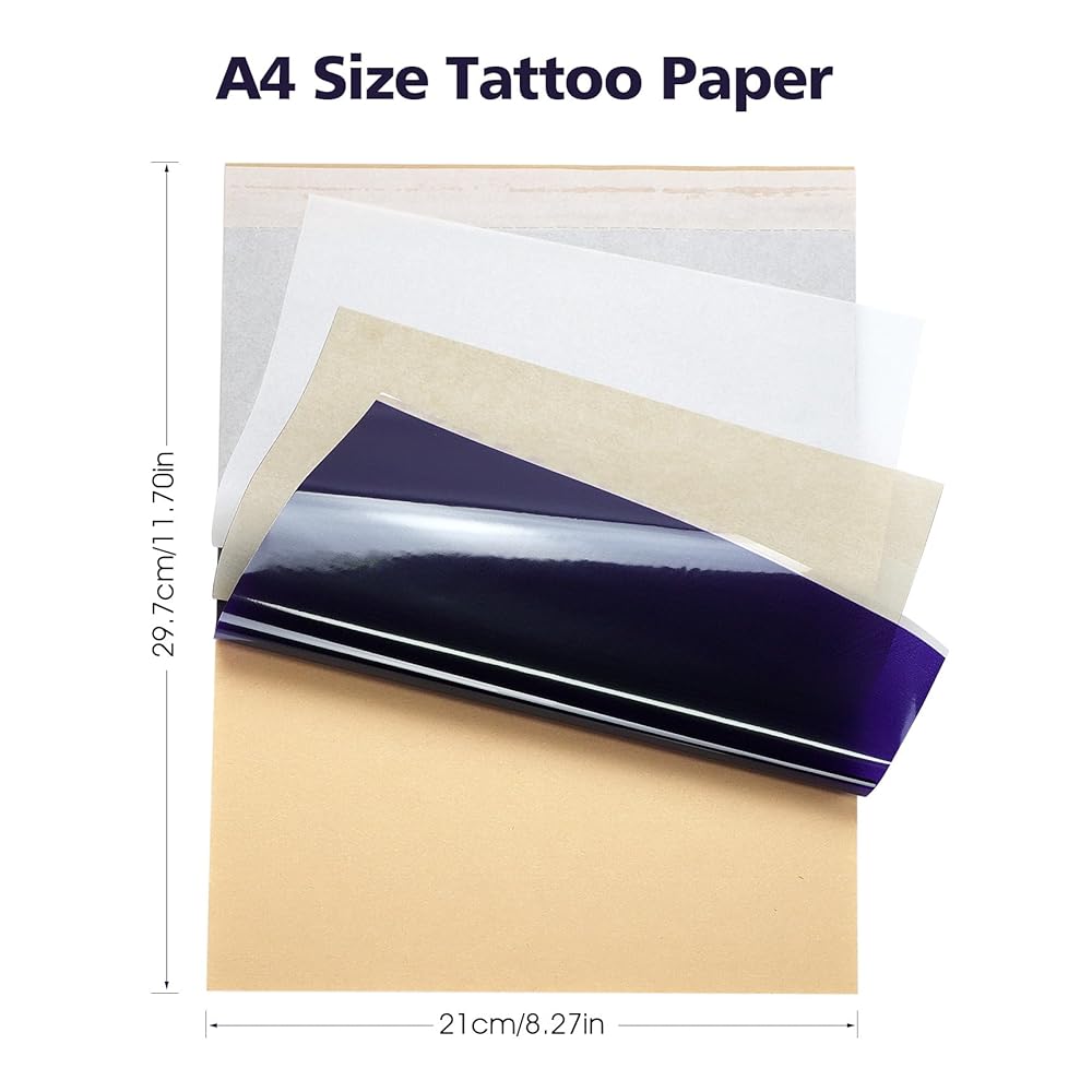 حجم A4 مع سهولة التخصيص - توفر الأوراق السخية مقاس 11 × 8.5 بوصة (A4) مساحة واسعة للتصميمات الكبيرة، ومع ذلك يمكن تشذيبها بسهولة للأعمال الفنية الأصغر حجمًا والمعقدة. يوفر مرونة مطلقة لأي مشروع وشم تتخيله.