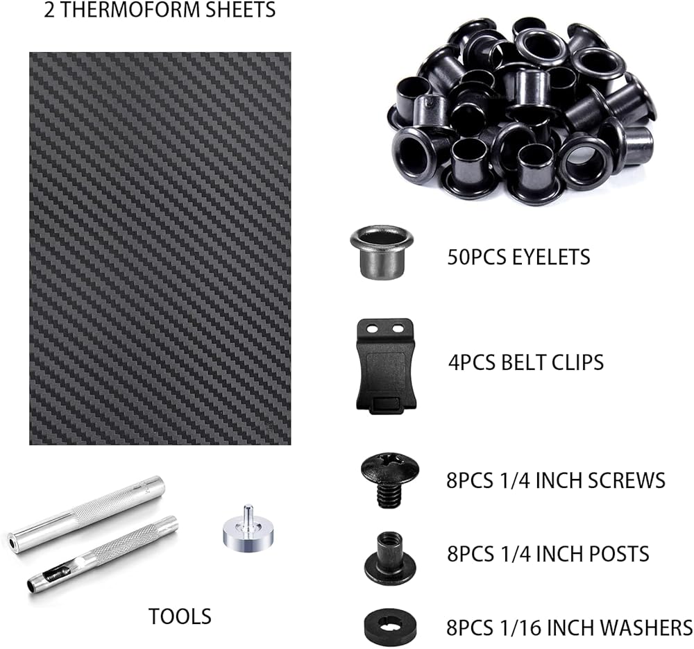 Create professional-grade custom holsters, knife sheaths, and keel guards with our DIY Holster Making Kit, designed for both beginners and experienced crafters. This 83-piece set includes everything needed for secure and reliable holster fabrication, from belt clips and thermoform sheets to screws, fasteners, rubber washers, and an easy-to-use eyelet hand setter tool. With our heat-moldable thermoform sheets, you can craft precision-fitted holsters by heating, shaping, and cooling the material to your desired form. The included cross recessed screws, slotted fasteners, and rubber washers provide secure assembly for belt clips and holster retention. Meanwhile, the eyelet setter tool allows for effortless eyelet installation with just a light tap of a hammer. Perfect for law enforcement officers, military personnel, security professionals, and holster makers, this all-in-one kit ensures that your holster crafting projects are streamlined and professional. Take your creativity to the next level with this versatile and durable holster-making set!