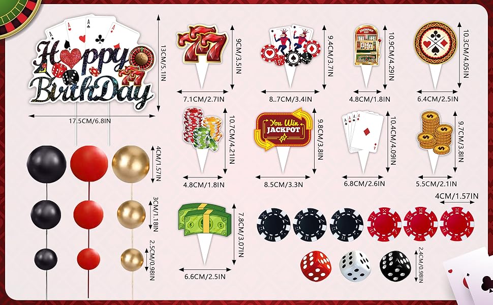 • لا تحتاج إلى تجميع: تأتي ديكورات كعكة الكازينو هذه مجمعة مسبقًا، لذلك لا تحتاج إلى تجميع أي شيء معًا. ببساطة أدخلها في كعكتك حسب تفضيلاتك، واضبطها على الارتفاع المرغوب فيه، ويمكنك إكمال الديكور بسرعة. يتيح لك هذا إنشاء تصميم كعكة واقعي على طراز الكازينو، مما يضيف لمسة مميزة إلى حفلتك مع توفير الكثير من الوقت والجهد في إعداد الحفلة.