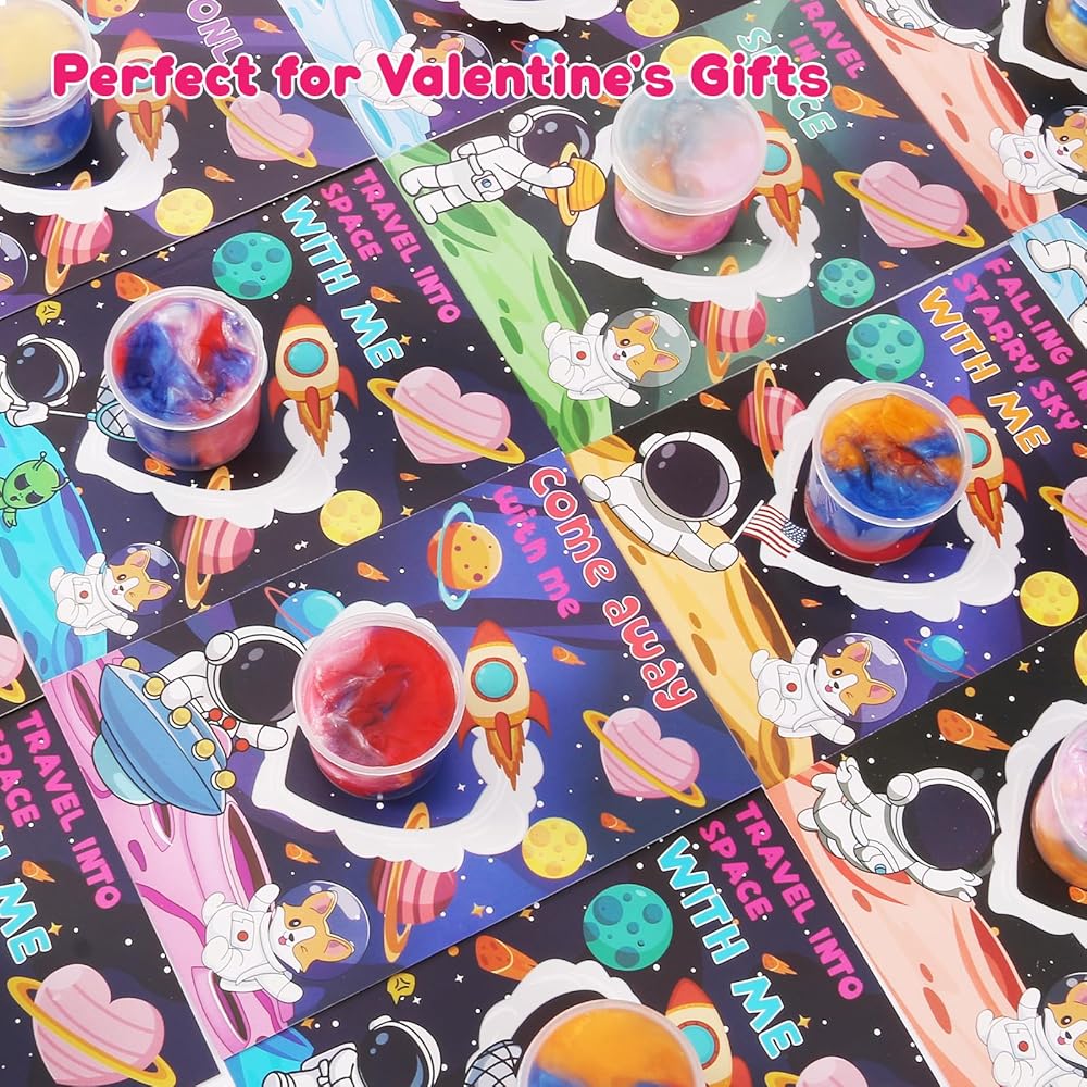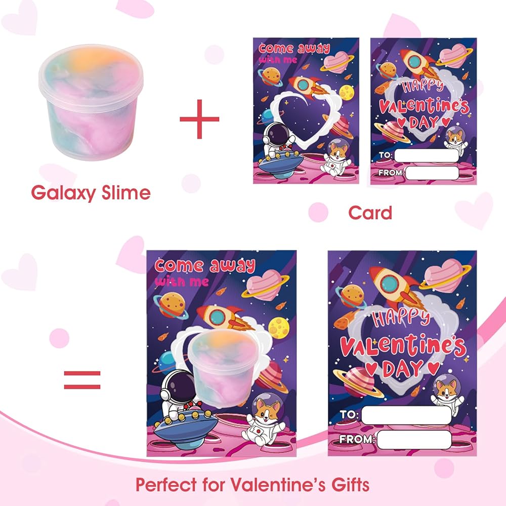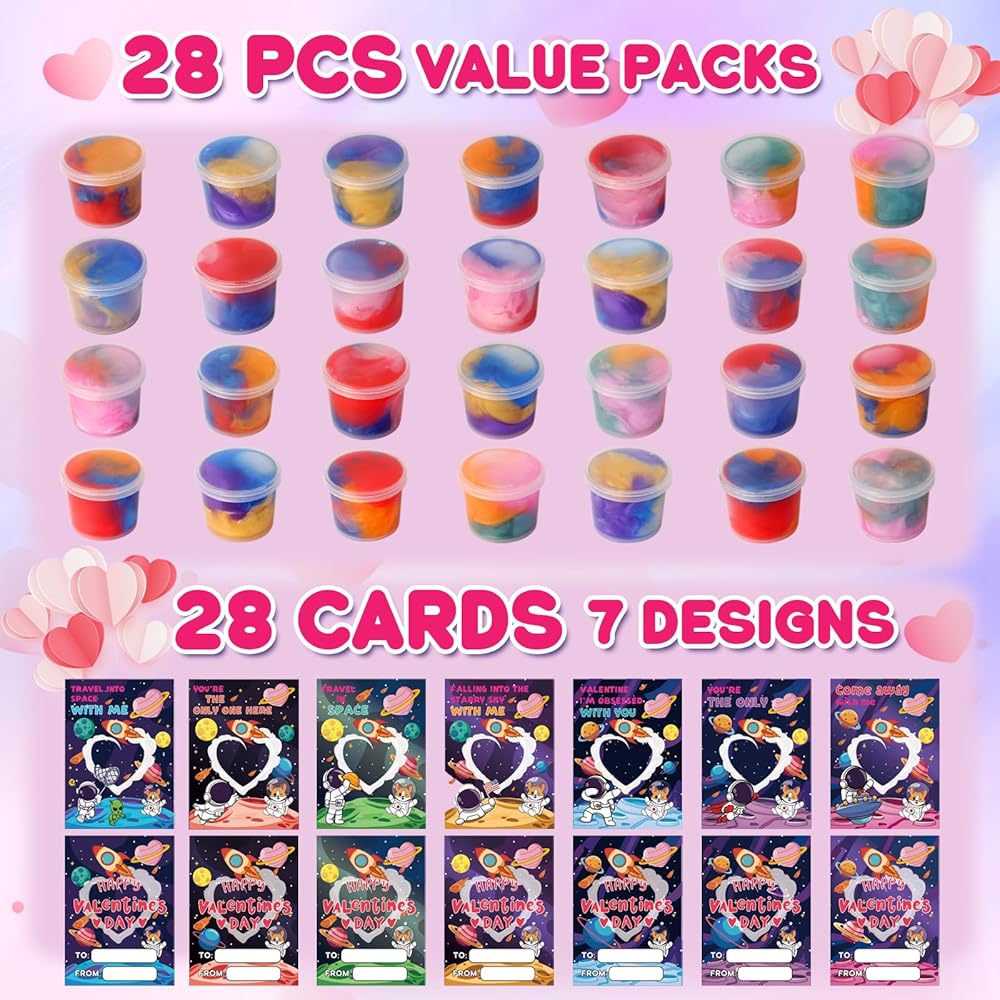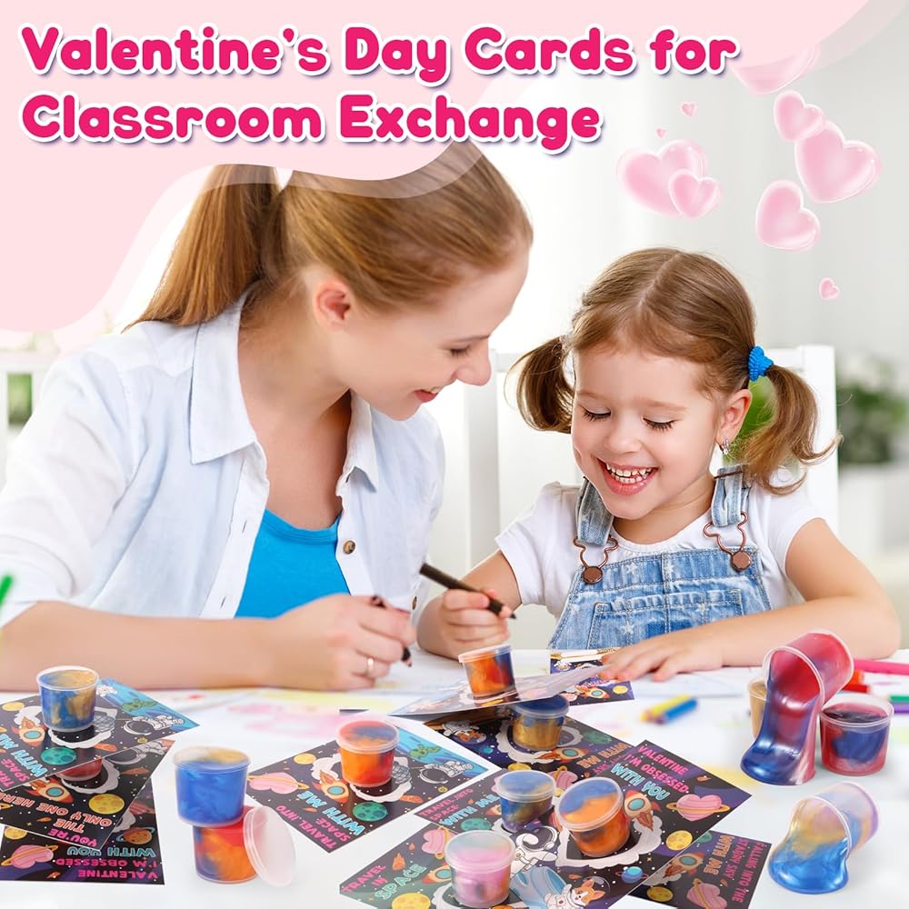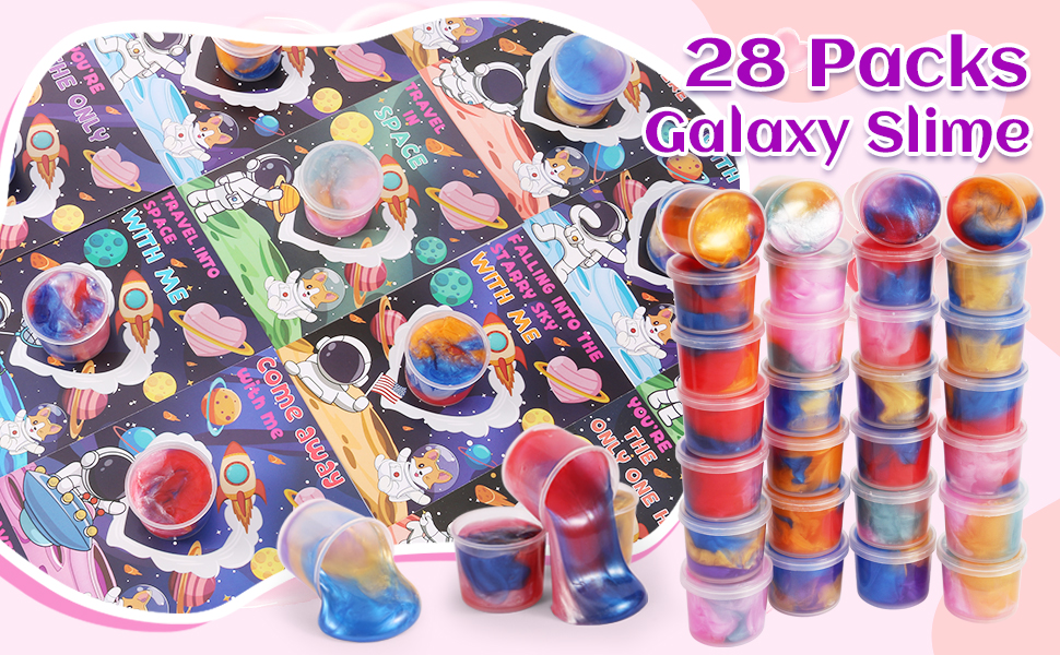28 حزمة من بطاقات عيد الحب للأطفال في المدرسة مع جالاكسي سلايم، ألعاب سلايم بطابع الفضاء مع بطاقات عيد الحب للأطفال في الفصل الدراسي وهدايا التبادل، هدايا الحفلات المدرسية للأولاد والبنات