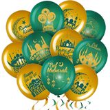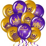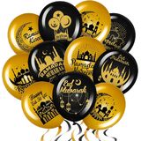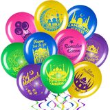 مستلزمات حفلات رمضان: بالونات عيد مبارك مصممة بـ 10 أنماط، مطبوعة بنمط وكلمات عيد الفطر، مثل القمر، والمبنى التقليدي، و[عيد فطر سعيد]، ستكون إضافة رائعة للديكور لديكور رمضان الخاص بك
