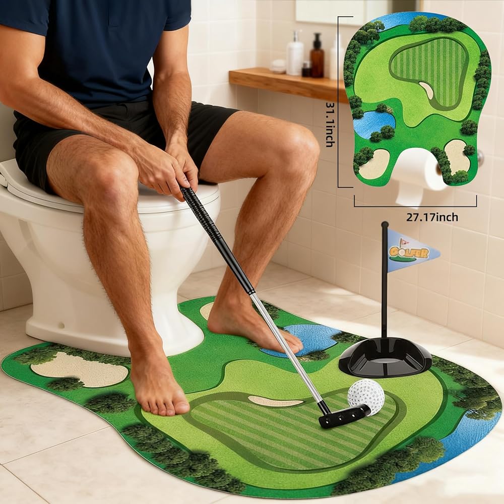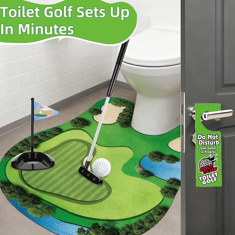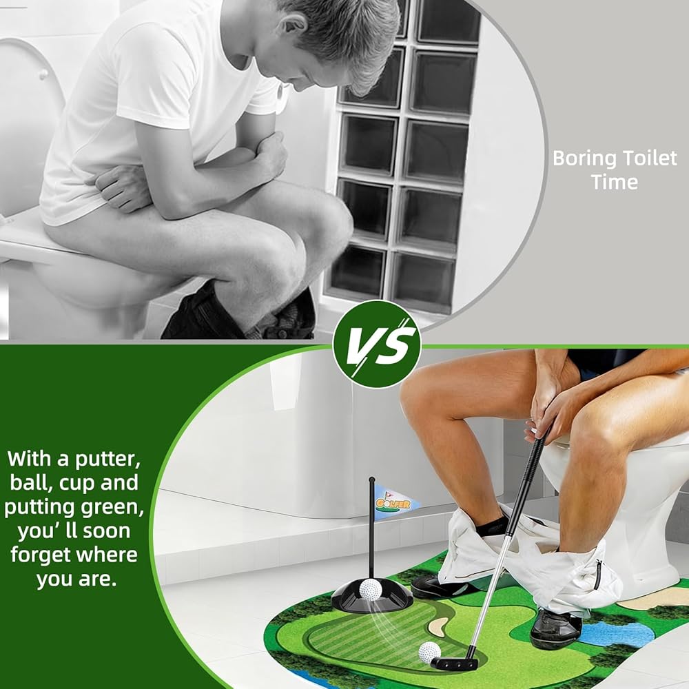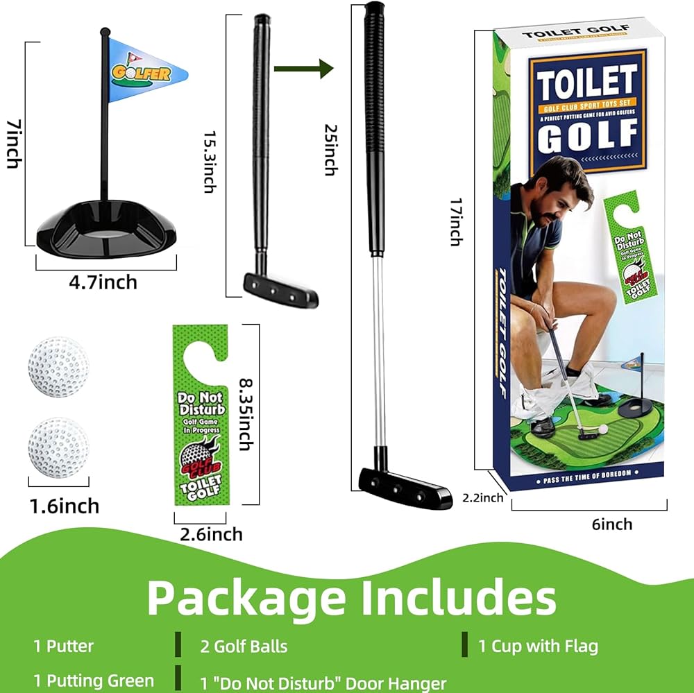 【مجموعة ألعاب الجولف للمرحاض】تأتي مجموعة هدايا الجولف المضحكة هذه مع 1 وضع أخضر وكرتين جولف و1 مضرب وفتحة مع علم و1 لافتة "ممنوع الإزعاج" للعب دون انقطاع، يمكنك صقل وضعك في حمامك من خلال لعبة جولف المرحاض!