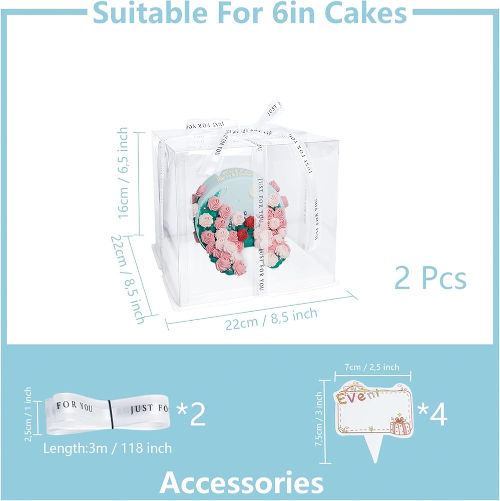 ✅【Package Includes】You will receive 2 complete sets of transparent cake boxes, The dimensions is 8,5x8,5x6,5inch/22x22x16cm,suitable for 6 inch cakes(not too tall). Two 3-meter ribbon, and four cute cake inserts. The bottom of the cake box is white and transparent around it, allowing you to clearly show your beautiful cake inside! Let your cake become the focus of everyone's attention!