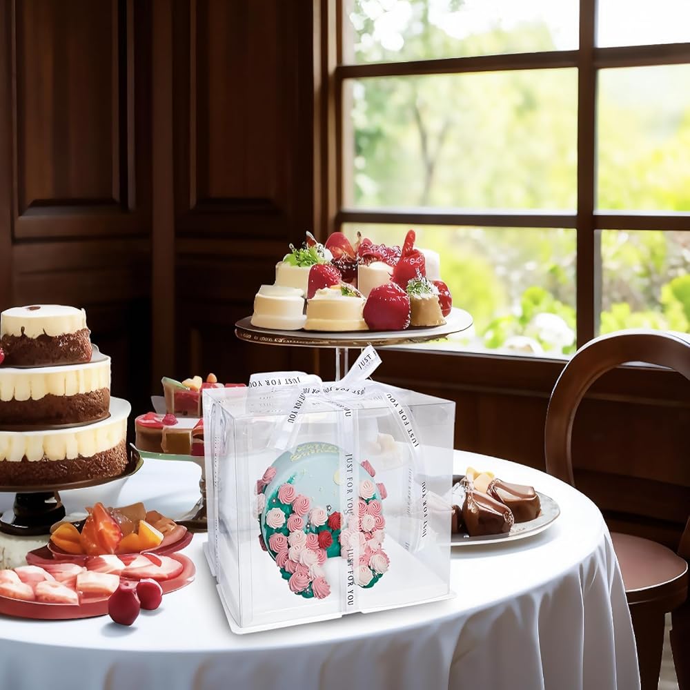 YASPOK Clear Cake Box, 2 Pcs Transparent Cake Carrier Box with Lids, 6'' PET Cake Packaging Boxes with Ribbon Gift Card for Pastries, Clear Gift Boxes for Birthday, Wedding and Festival Party, White.