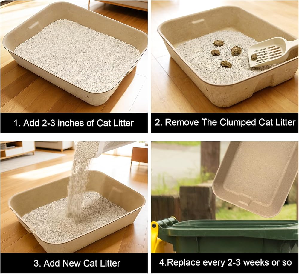 【نظيف وصحي】 يوصى باستبداله كل 2-3 أسابيع أو حسب الحاجة، اعتمادًا على عادات القطط ونوع الفضلات. إن استبدال صندوق فضلات القطط الجديد بانتظام يمكن أن يمنع بشكل فعال تراكم الروائح على المدى الطويل