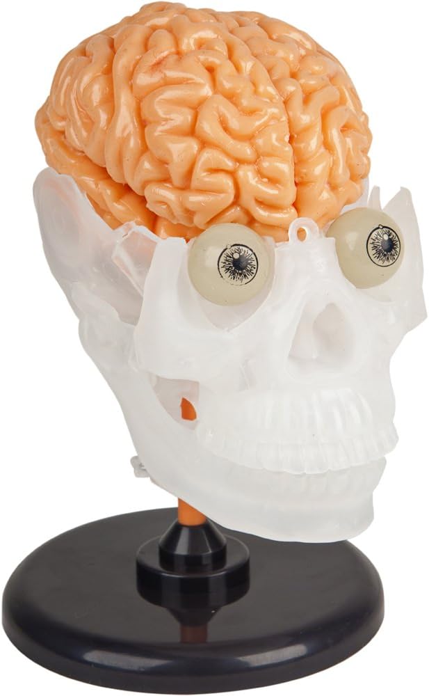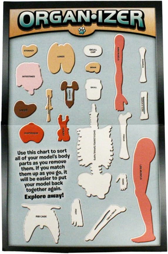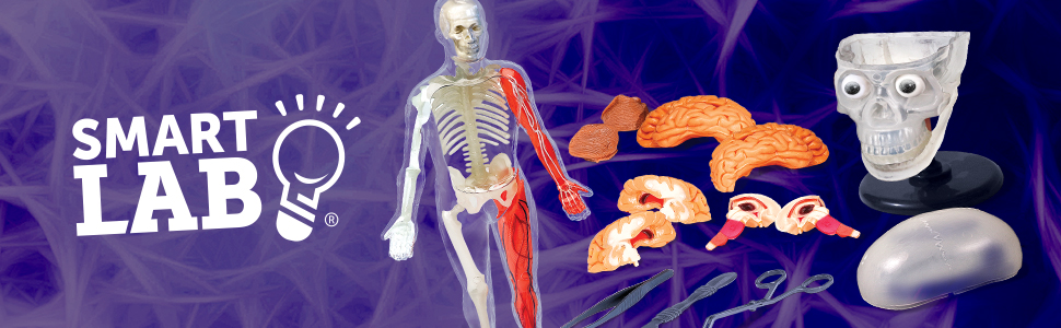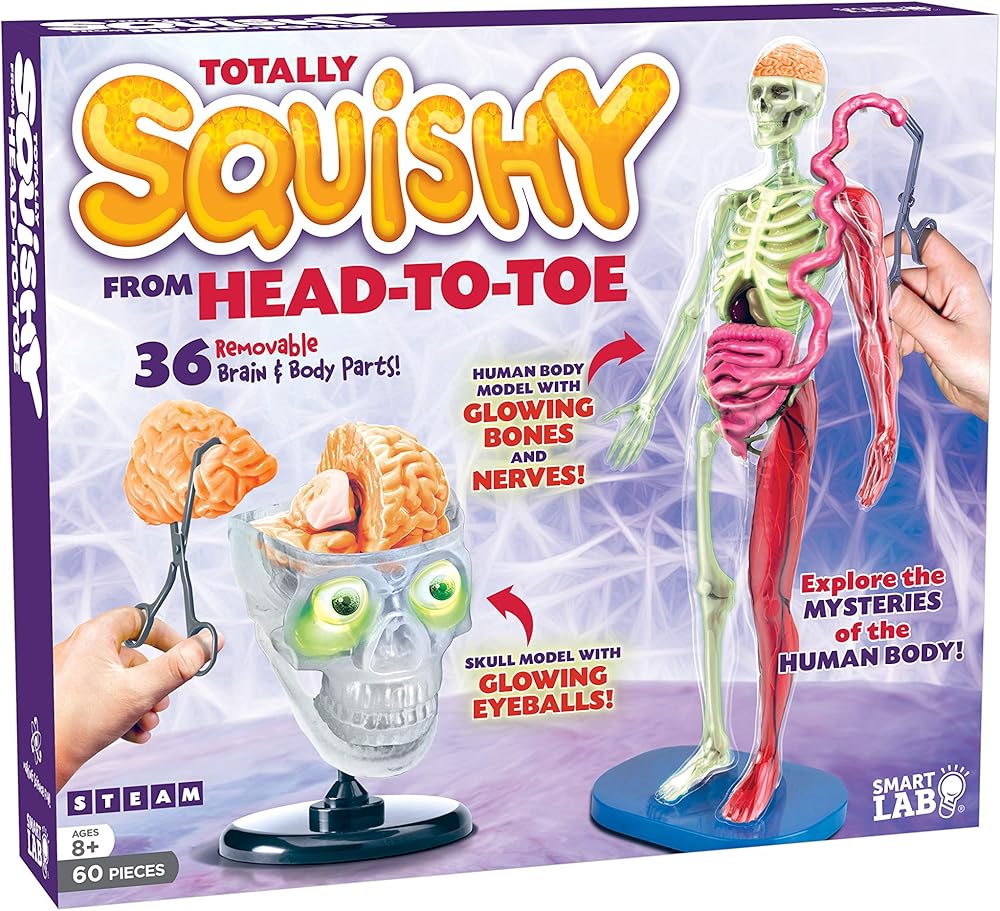 Explore the squishy insides of the human body and brain using plastic forceps and tweezers. Build an 8 piece skull model with moving mandible and squishy brain. And, enter the twisted world of the human body, complete with removable squishy organs, such as the lungs, heart, liver and intestines. Glowing parts include: skull, bones, nerves, and eyeballs. Amazing physical facts abound in this kit's book and activity cards.