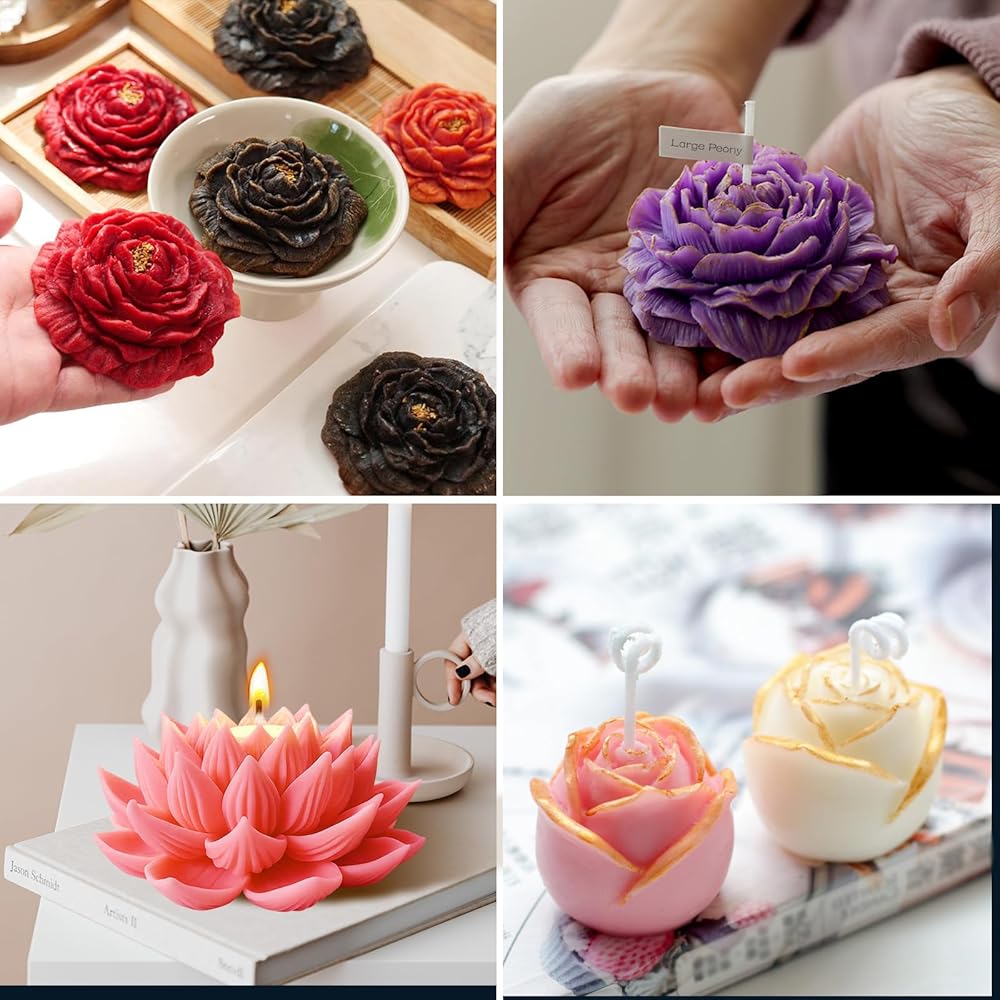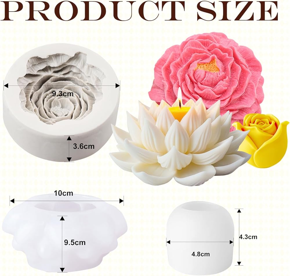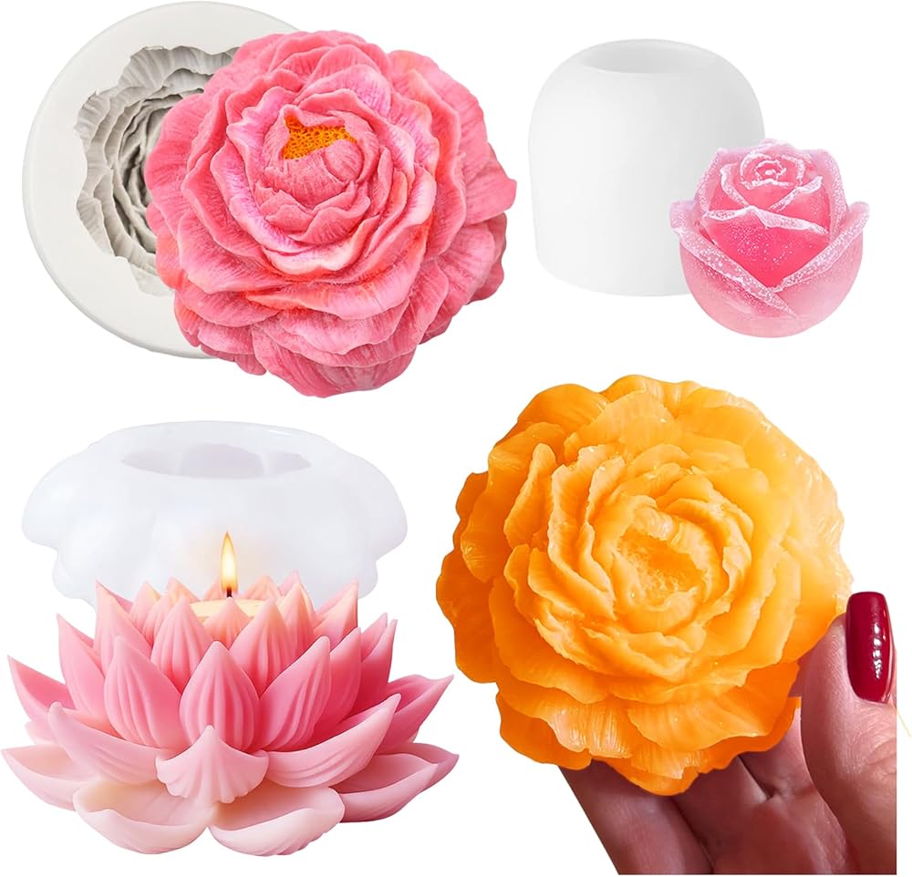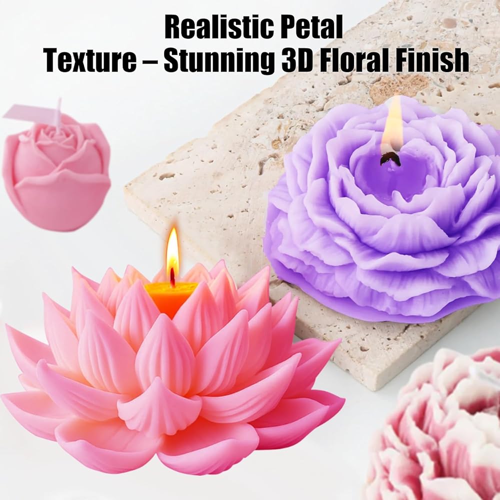 Create beautiful crafts with this 3-piece flower candle mold set featuring lotus, peony, and rose designs, offering detailed, realistic textures.