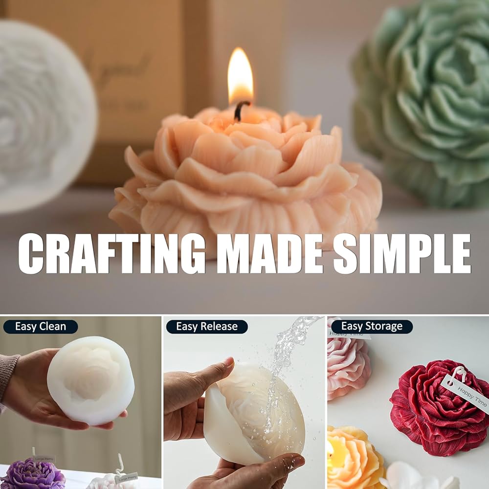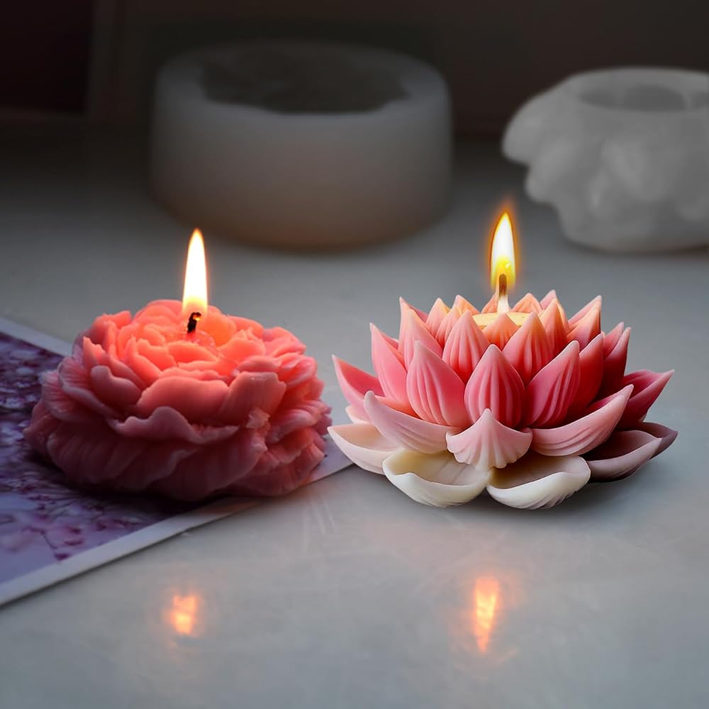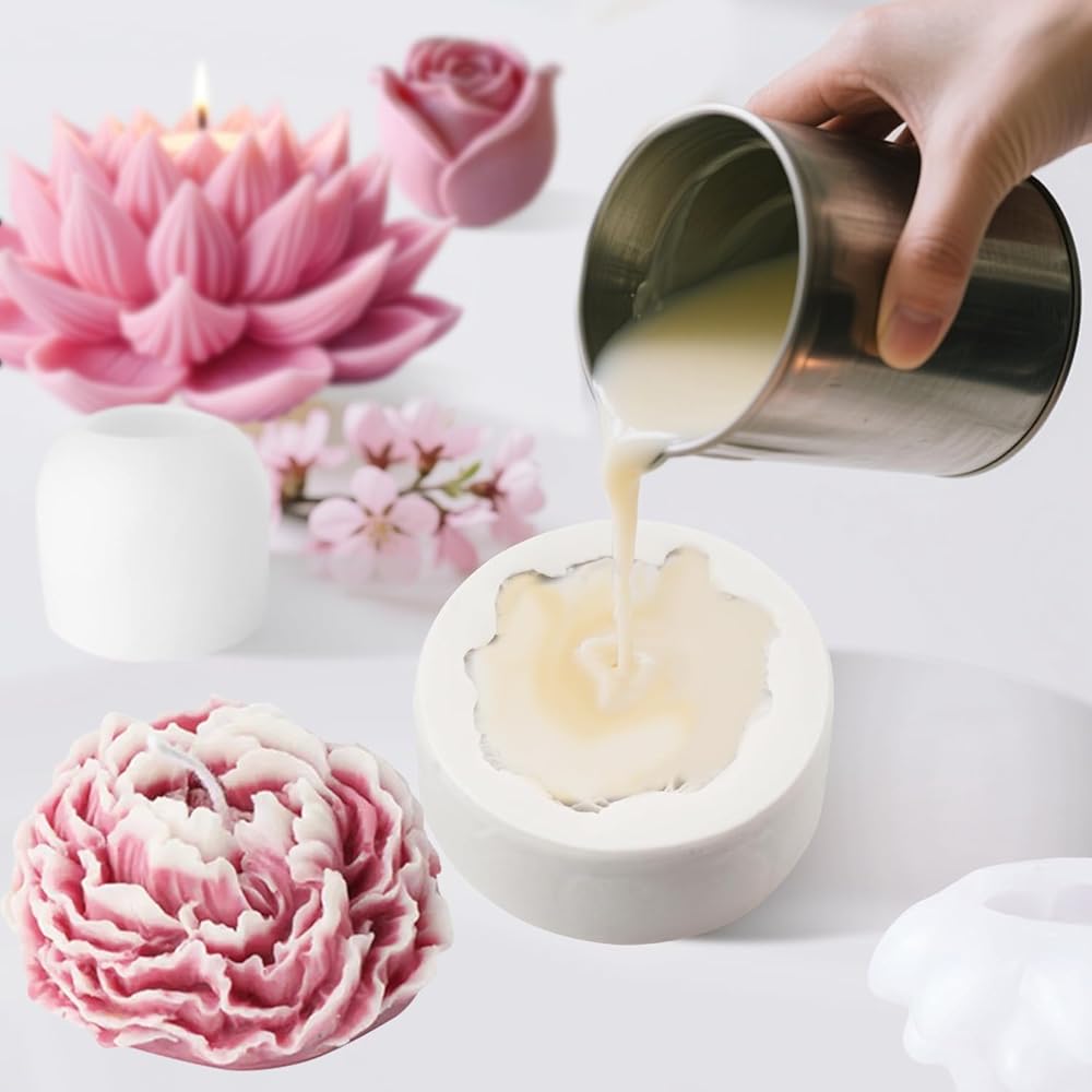 Create beautiful crafts with this 3-piece flower candle mold set featuring lotus, peony, and rose designs, offering detailed, realistic textures.