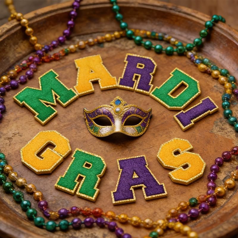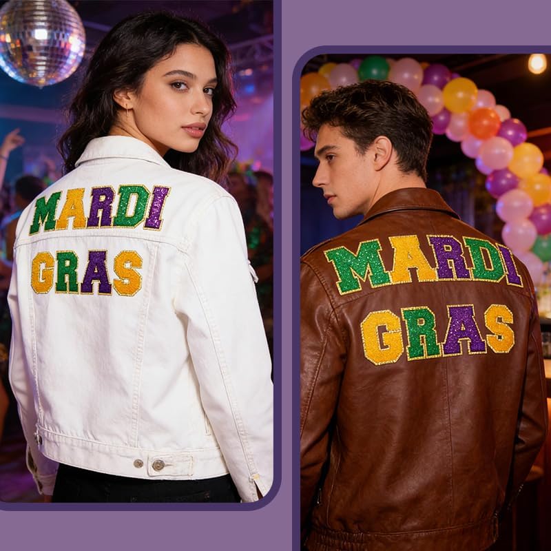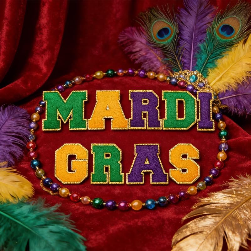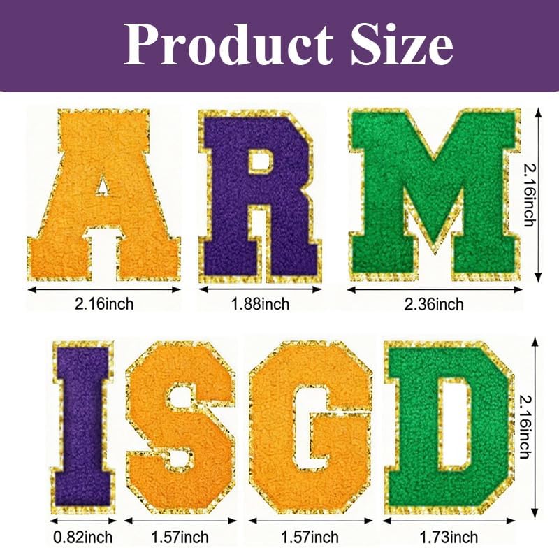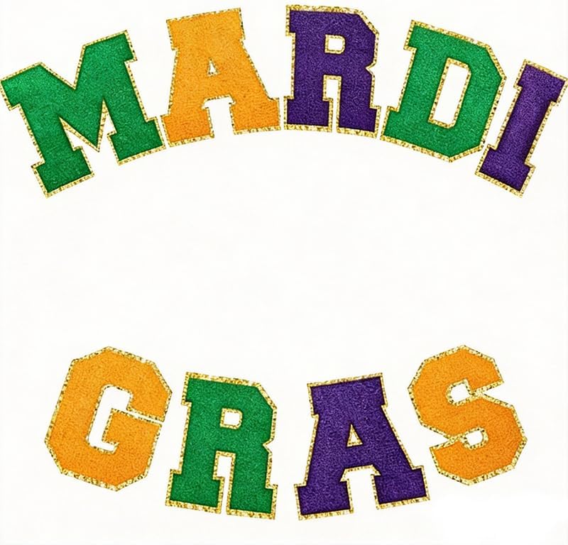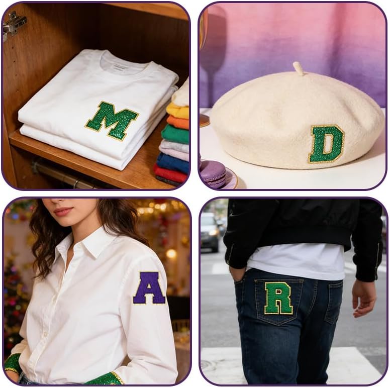 【Package Contents】This set includes 9 Pcs Iron On Patches Set, Purple Gold Green Glitter Letter Patch in classic carnival colors. The package provides ample pieces for multiple DIY projects, allowing you to decorate various festive garments and accessories as iron on patches or creative carnival applique designs.