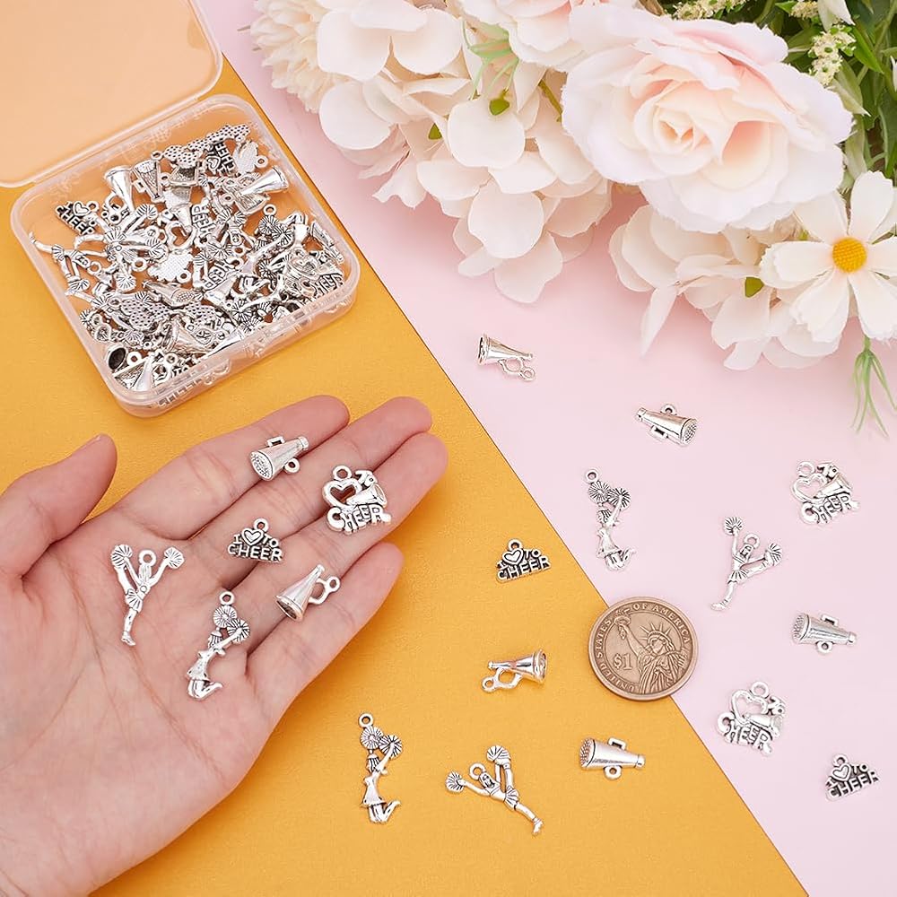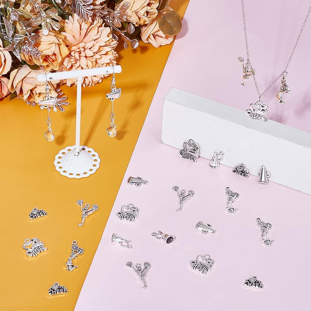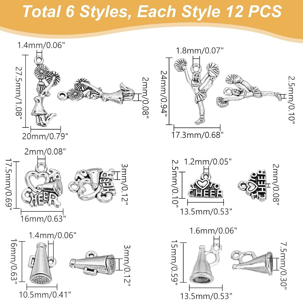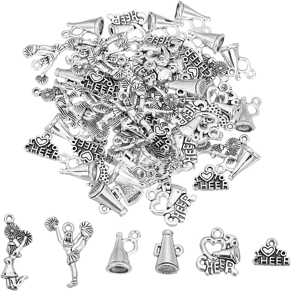 UNICRAFTALE حوالي 72 قطعة من سلسلة التشجيع المعلقات 6 أنماط سحر التشجيع المعدنية سحر الرياضة المدرسية مع حلقة العتيقة الفضة الجمباز سحر DIY القرط قلادة سوار صنع المجوهرات