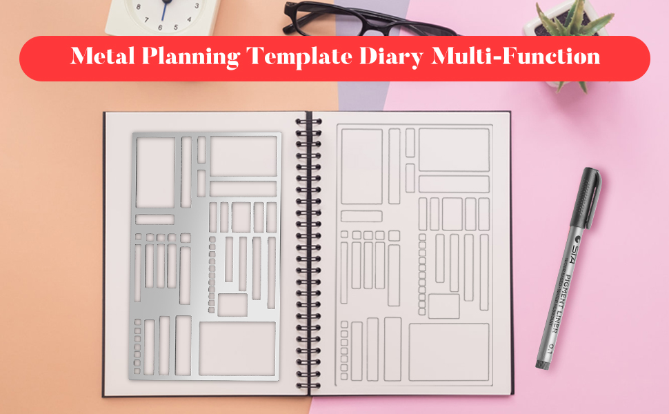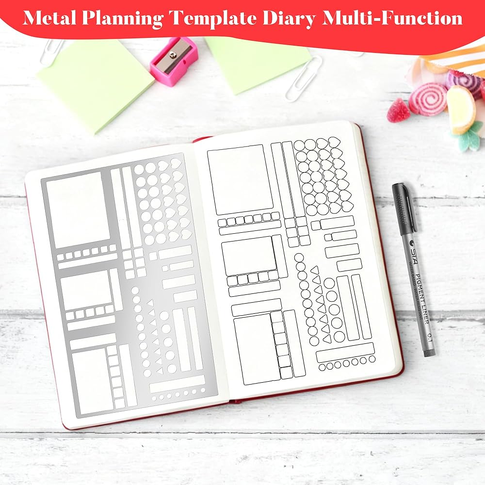 【مجموعة التخطيط الكل في واحد】تتضمن مجموعة استنسل المخطط المعدني قلمًا واحدًا وثلاثة قوالب متعددة الاستخدامات مصممة لتدوين الرصاص وتتبع العادات. يمكنك إنشاء فروق أسبوعية وشهرية بسهولة باستخدام المساطر وقوائم المراجعة والأنماط الزخرفية المضمنة. تساعدك قوالب اليوميات هذه على تنظيم جدولك الزمني مع إضافة لمسة إبداعية إلى مخططك أو دفتر ملاحظاتك مقاس A5.