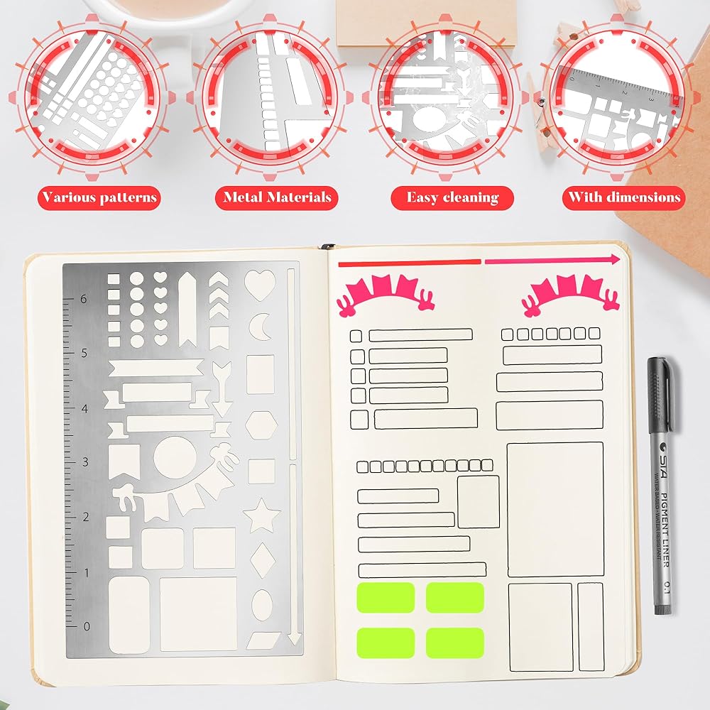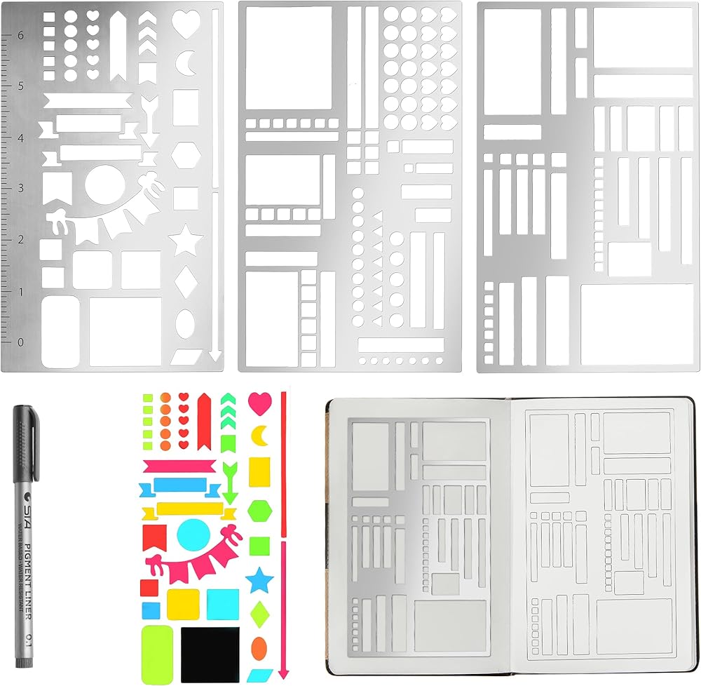 مجموعة استنسل معدنية مكونة من 3 قطع - قوالب استنسل للمجلات مع مسطرة لتدوين الرصاصات، وتتبع العادات، والفروق الأسبوعية والشهرية، وملحقات أجهزة الكمبيوتر المحمول مقاس A5، وتصميم من الفولاذ المقاوم للصدأ (قلم واحد)