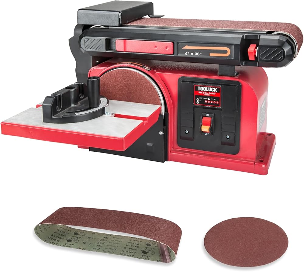 【What you get】1 X KITLUCK 5.2A Bench Belt Sander with 4" x 36" Belt and 6" Disc, 2 X Belt Sandpapers(1pc Installed), 2 X Disc Sandpapers(1pc Installed), 1X Hex Wrench, 1X Back Stop, 1X Disc Sanding Work Table, 1 X Miter Gauge, 1 X User Manual.