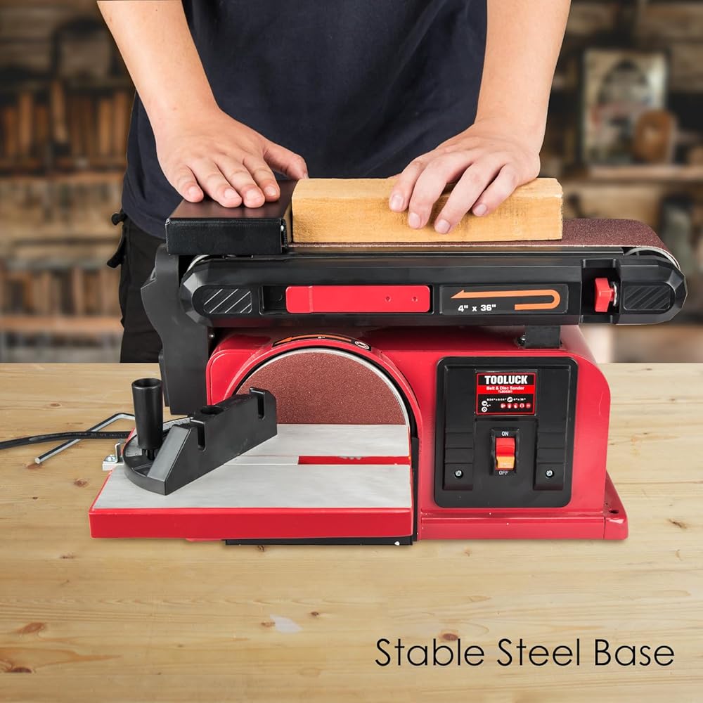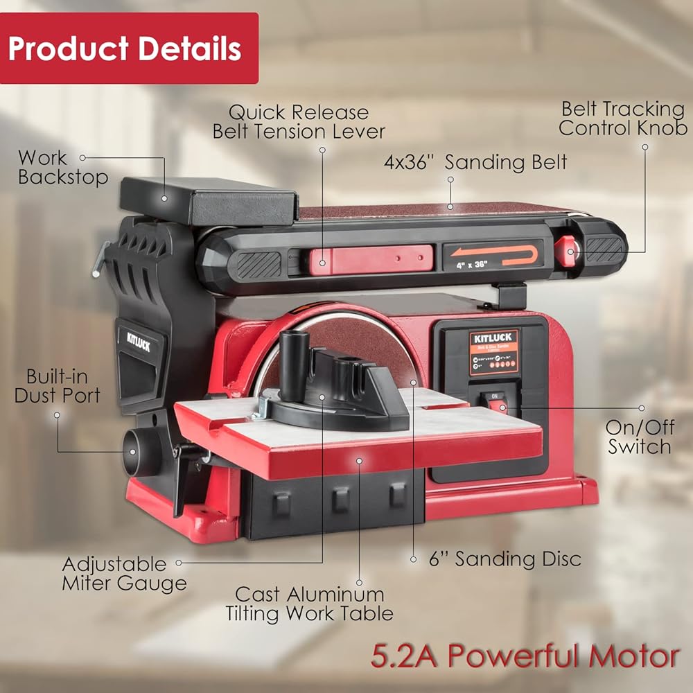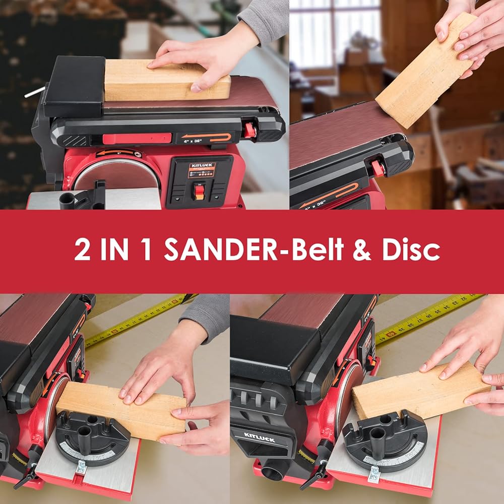 【5.2Amp Powerful Motor】 KITLUCK Belt Disc Sander is powered by a 5.2A motor, which provides more strong and stable power compared to other similar 4 Amp bench belt sander. With this upgraded motor,this belt sander can provides efficient and stable speed: 3550 RPM(Disc Speed) and 1575RPM(Belt Speed). Ideal for a wide range of sanding tasks on wood, metal and other materials.
