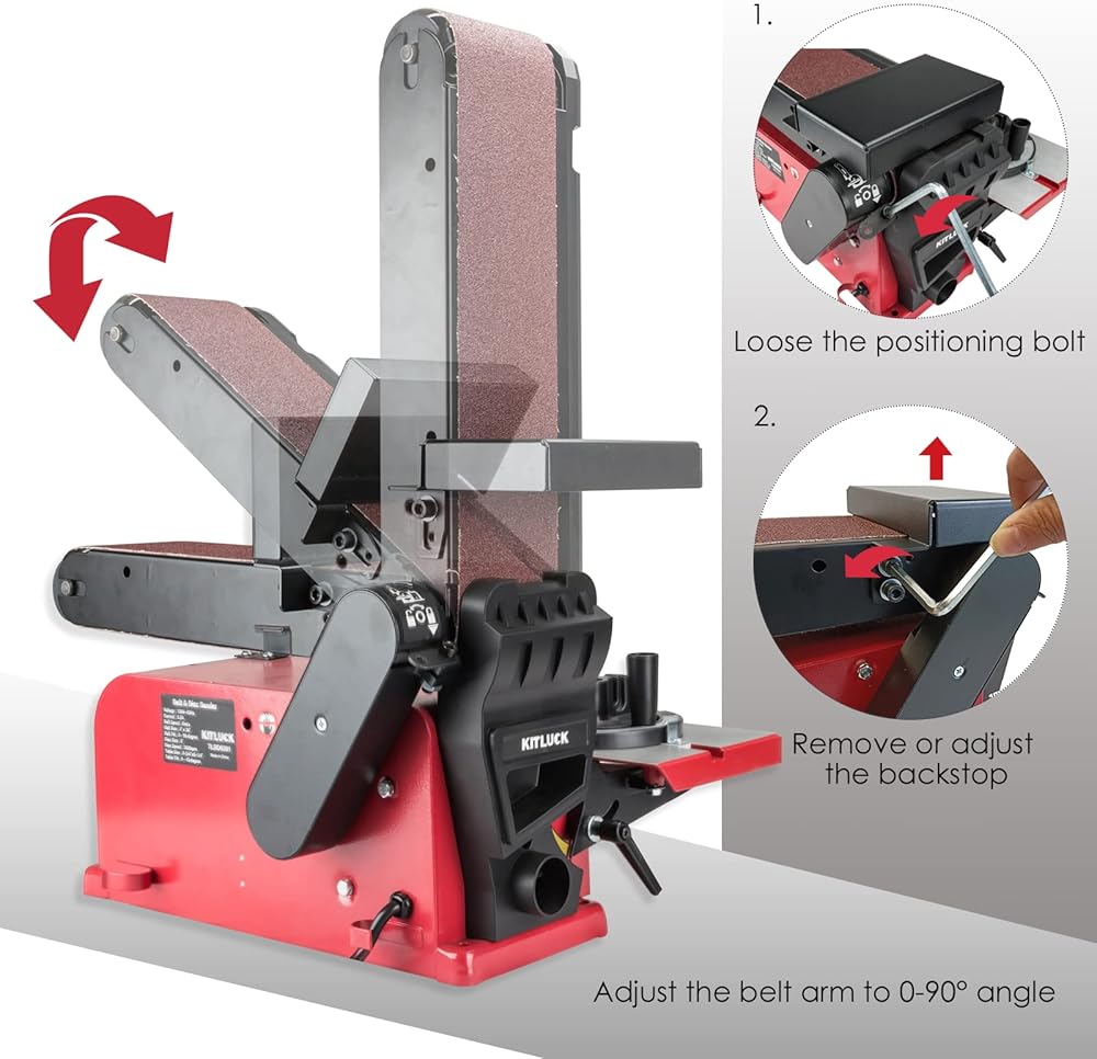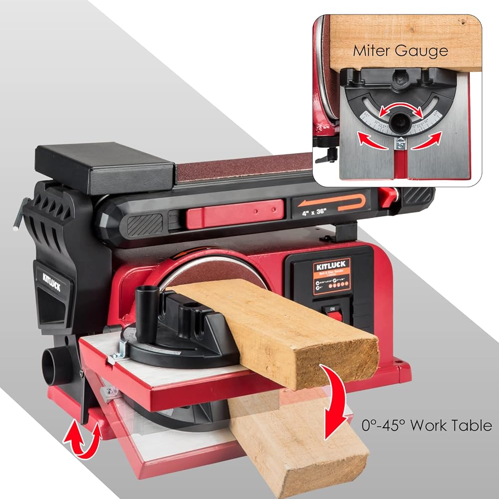 【Adjustable Belt & Work Table Tilt】 The belt of KITLUCK bench sander can be adjusted from 0°- 90° to provide different positions and angles for sanding different shapes and sizes of wood and metal work pieces. With the hex wrench, you can easily loose the positioning bolt, remove or adjust the back stop and then adjust the belt arm. The work table with miter gauge can be tilted from 0°-45°for bevel grinding, improving accuracy disc sanding, suitable for precise sanding. It's ideal for woodworking and all your DIY needs.