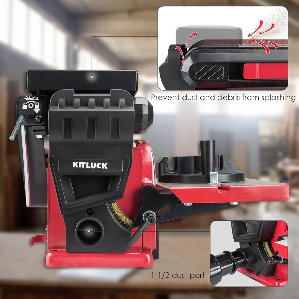 【Dustless Design for Woodworking】 KITLUCK belt sanders for woodworking is equipped with 2 independent dust exhaust area, collecting dust generated during the use of belts and discs respectively. 1-1/2 dust port helps minimize dust and debris around the workspace. Unlike other benchtop belt sanders, we have designed the back stop in a box shape so that it completely covers the end of the belt, preventing dust and debris from splashing in all directions and maximizing access to the dust collection area.