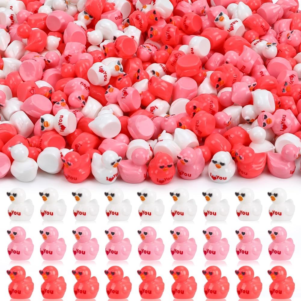120 Pcs Valentines Day Resin Mini Ducks Valentine's Day Red Pink White Letter Tiny Resin Ducks Bulk Tiny Miniature Duck Figures for Home Tabletop Micro Garden Landscape Decoration Craft Party Favors