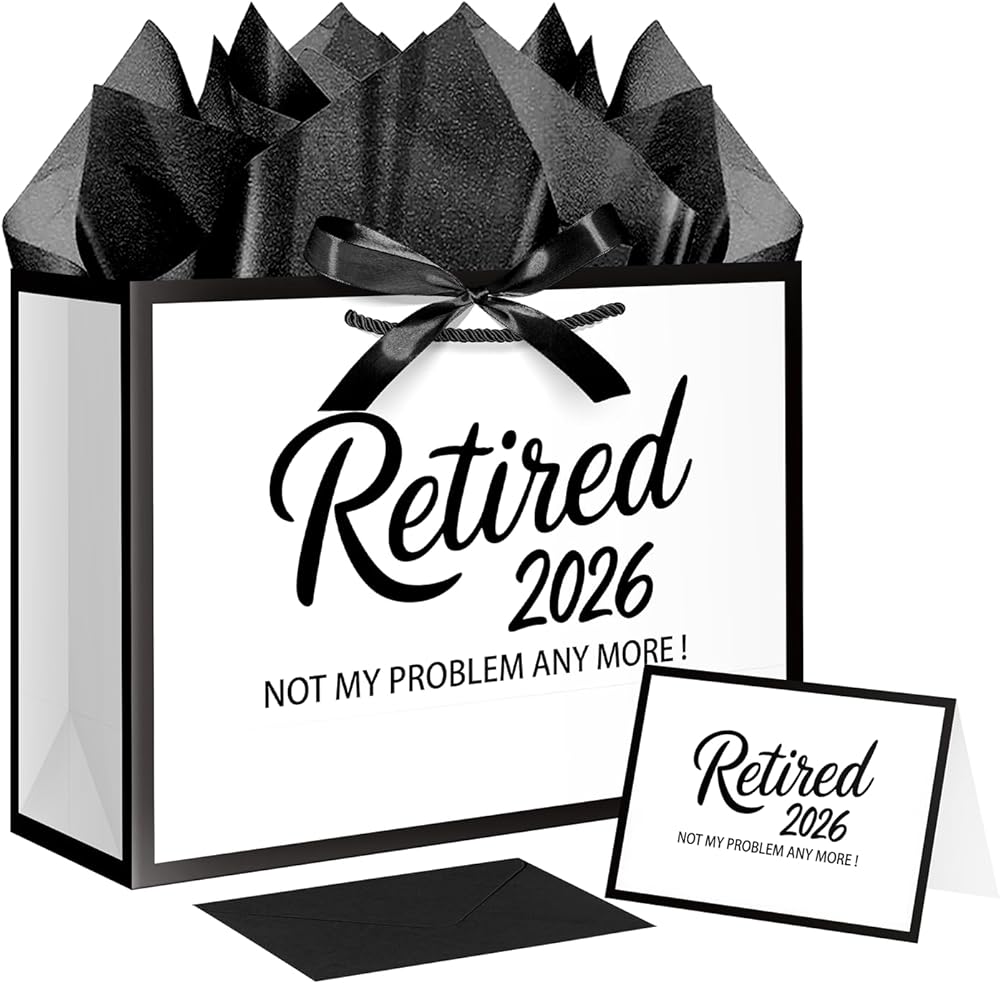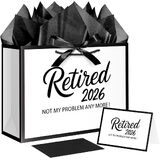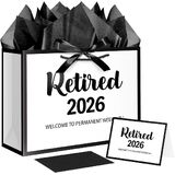 Quantity and Size: 12.6" White and Metallic Black Retirement Gift Bag with Tissue Paper, Envelope and Card 12.6" Wide x 10" High x 4.3" Deep.