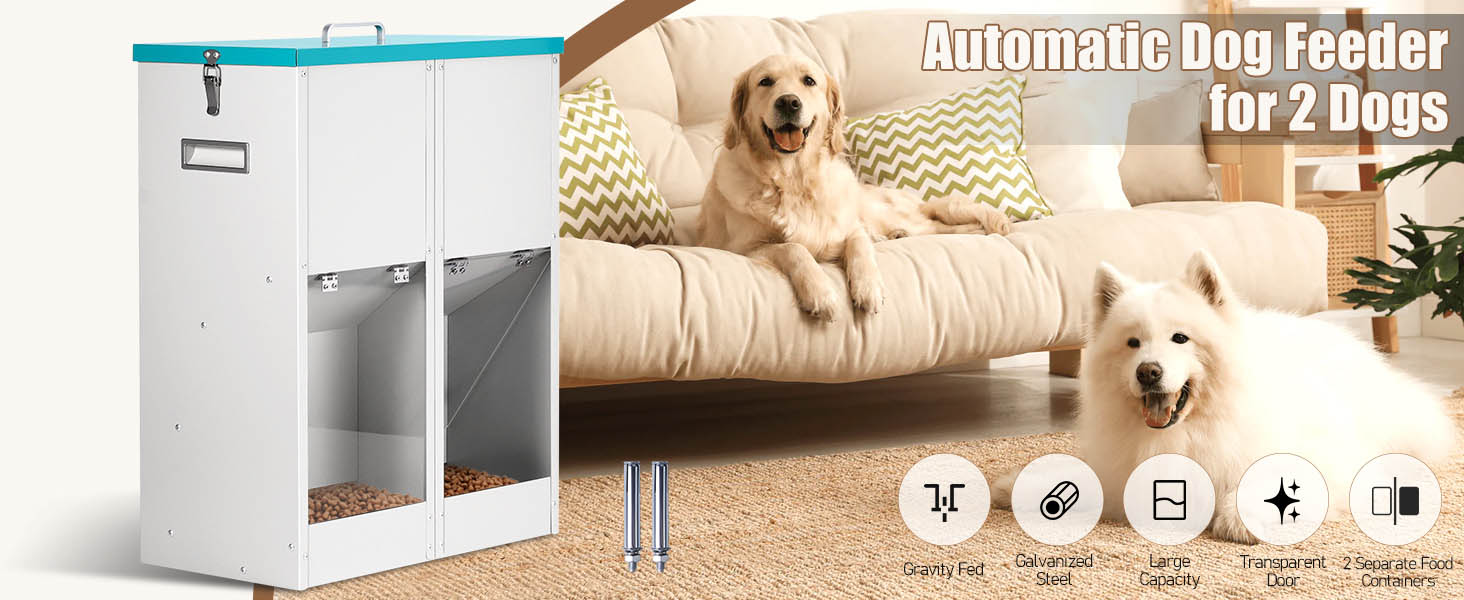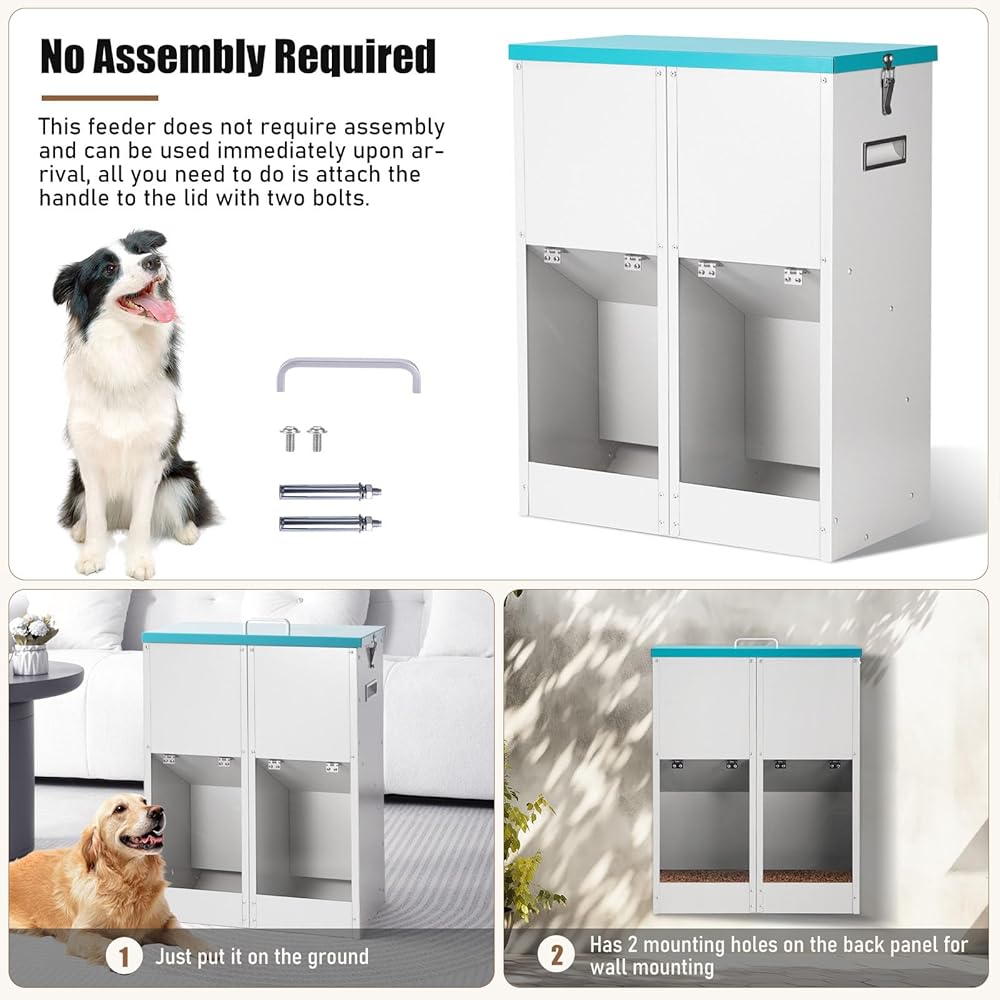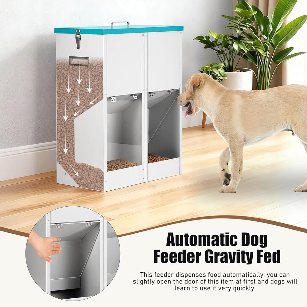 وحدة تغذية أوتوماتيكية للكلاب من الجاذبية لكلبين - لا تحتاج إلى تجميع، سعة 46 رطل، موزع طعام للكلاب ذاتي التغذية من المعدن المجلفن، وحدة تغذية مزدوجة للحيوانات الأليفة للاستخدام الخارجي والداخلي
