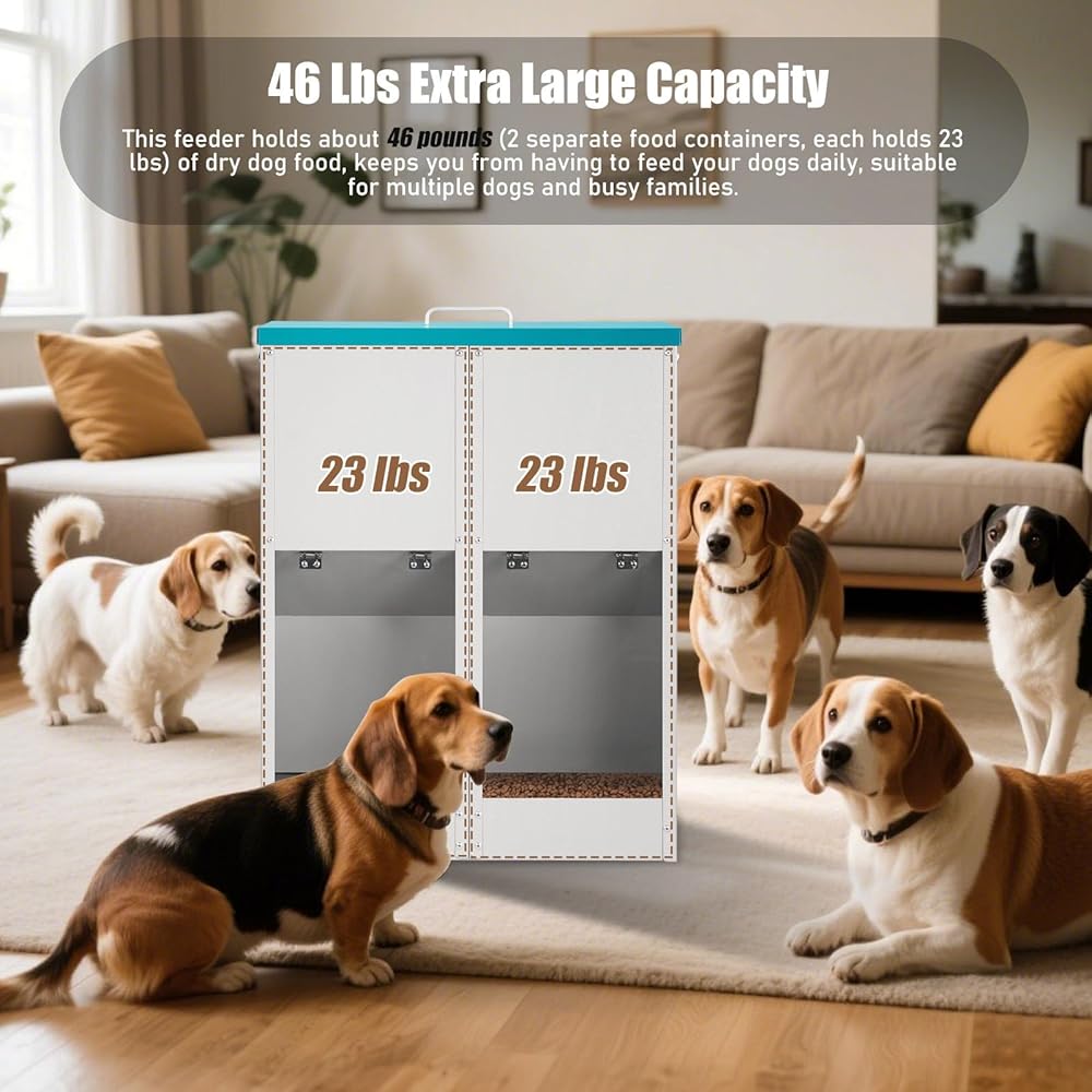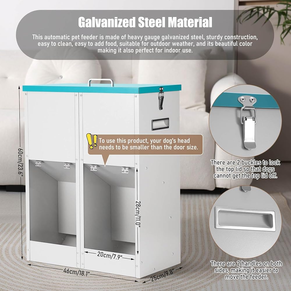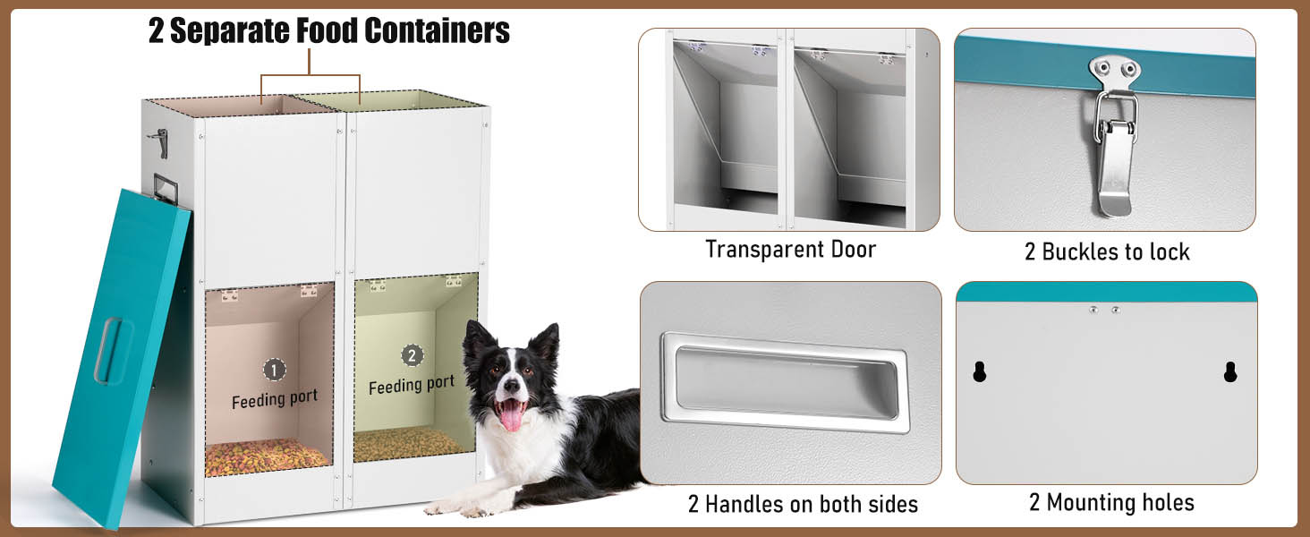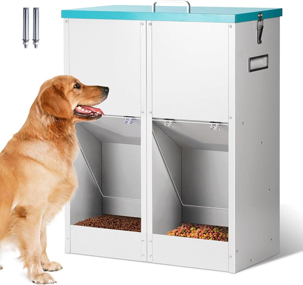 سعة كبيرة جدًا ومادة فولاذية مجلفنة: يحمل جهاز تغذية الكلاب هذا حوالي 46 رطلاً (حاويتين طعام منفصلتين، كل منهما يحمل 23 رطلاً) من طعام الكلاب الجاف، مما يمنعك من الاضطرار إلى إطعام كلابك يوميًا، وهو مناسب للعديد من الكلاب والعائلات المشغولة.