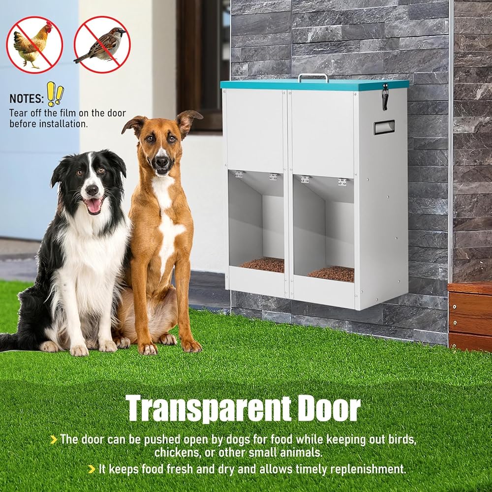 باب شفاف: يمكن للكلاب دفع باب وحدة التغذية الذاتية الخارجية هذه للطعام مع إبعاد الطيور أو الدجاج أو الحيوانات الصغيرة الأخرى؛ فهو يحافظ على الطعام طازجًا وجافًا ويسمح بالتجديد في الوقت المناسب