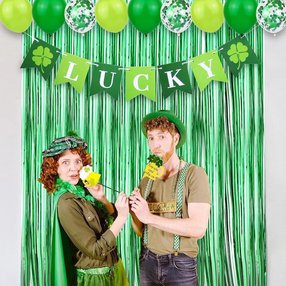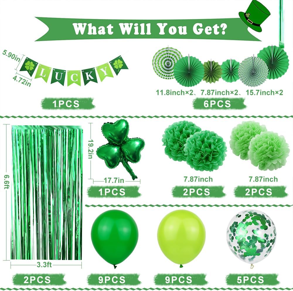Super Value Pack: This set is a one-stop solution for your St. Patrick's Day decorating needs. It includes 2 Packs Tinsel Curtains Backdrop, 1pcs LUCKY banner, 6pcs paper fans, 4 Tissue Pom Poms,1 Shamrock Foil Balloon, 5pcs Confetti Balloons and 18pcs Latex Balloons.