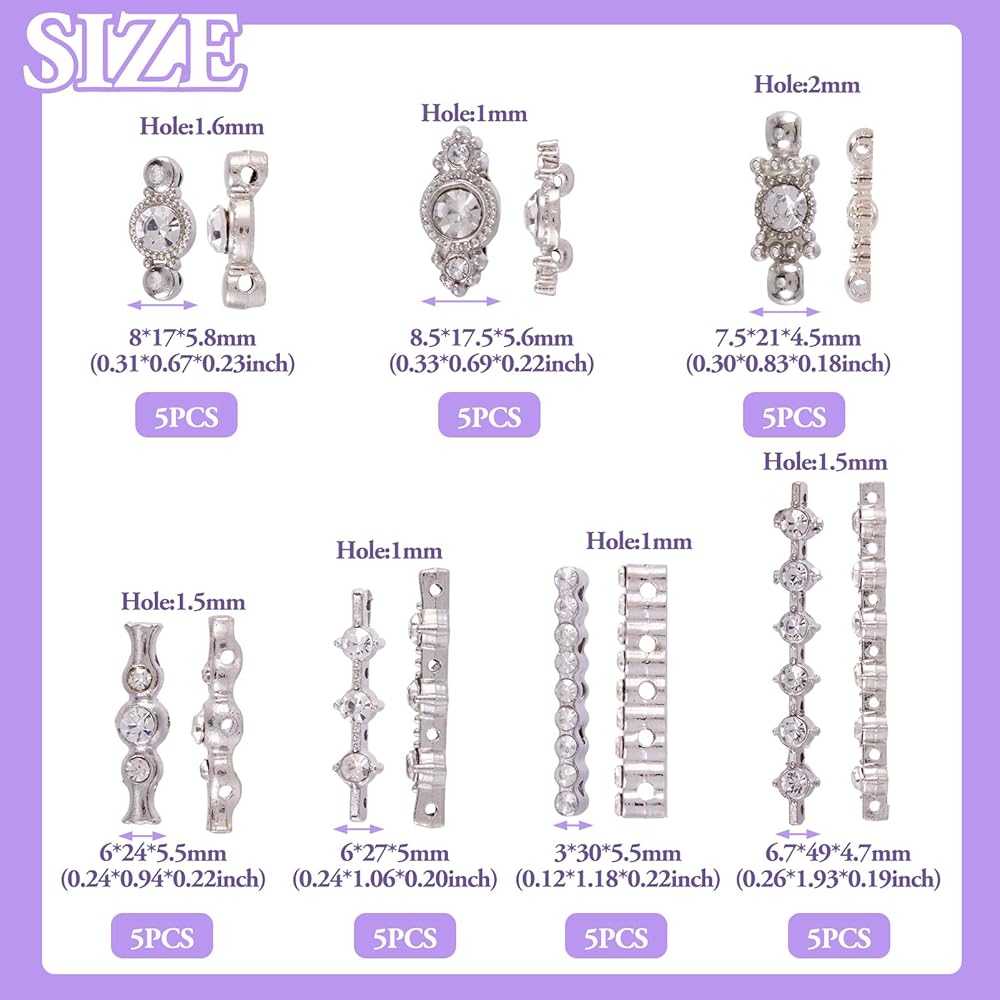 Alloy Grade A Rhinestone Spacers: about 0.34x1.15x0.25 inch(8.7x29.3x6.4mm), hole: 0.05 inch(1.2mm), 5pcs;