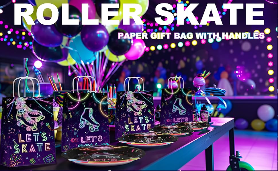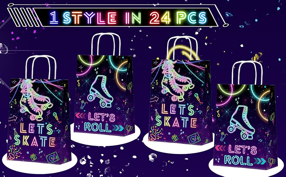 • تصميم نيون رولر سكيت - حقائب حفلات نيون ساطعة تتميز بزلاجات دوارة وأضواء متوهجة وأيقونات موسيقية وعبارات ممتعة مثل "Let's Skate" و"Let's Roll".