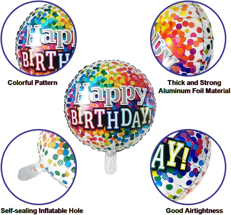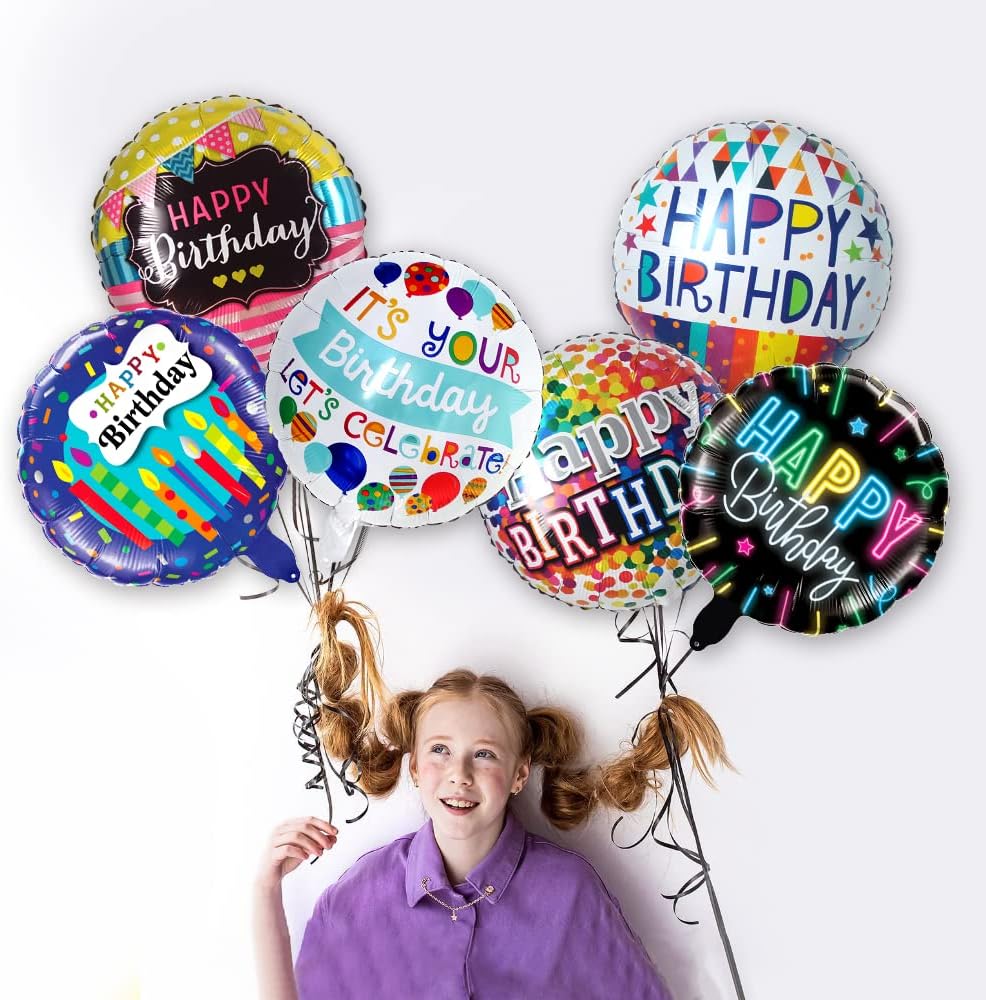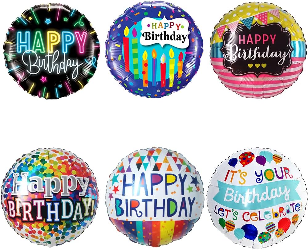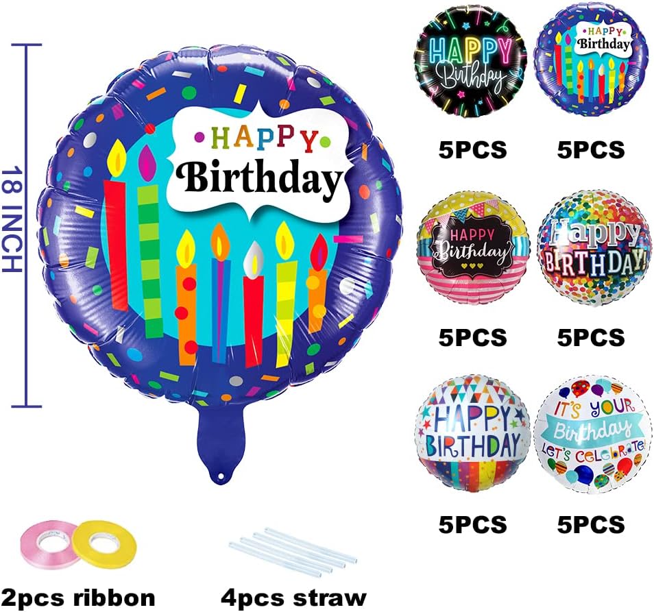 العبوة: 30 عبوة 6 تصميمات مختلفة من بالونات عيد ميلاد سعيد مستديرة مقاس 18 بوصة. هذه العبوة القيمة كافية لتزيين مساحة حفلتك.