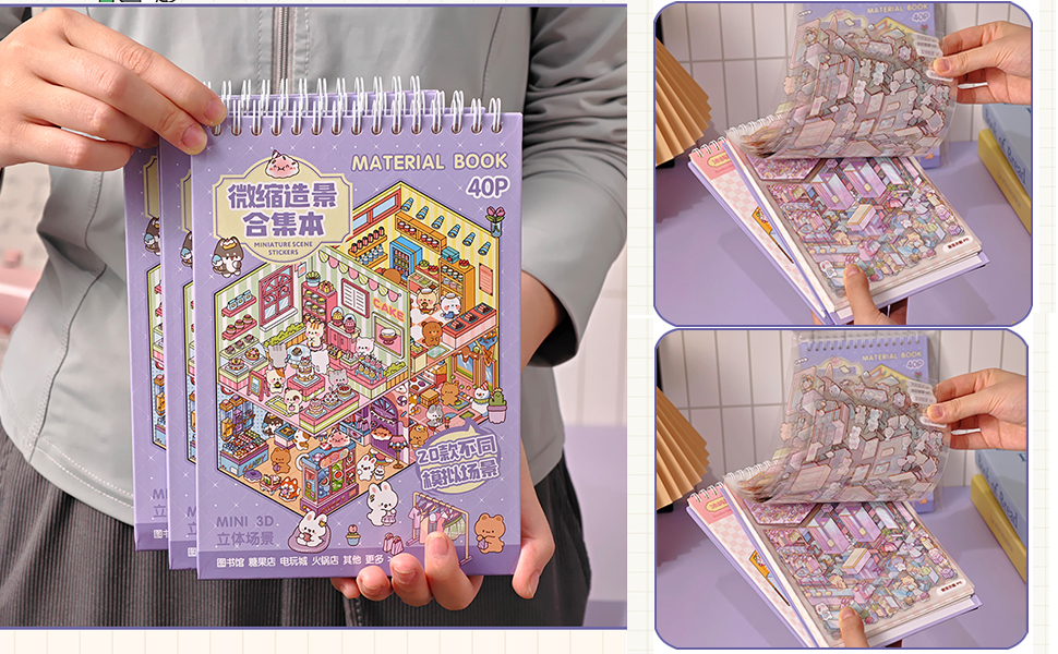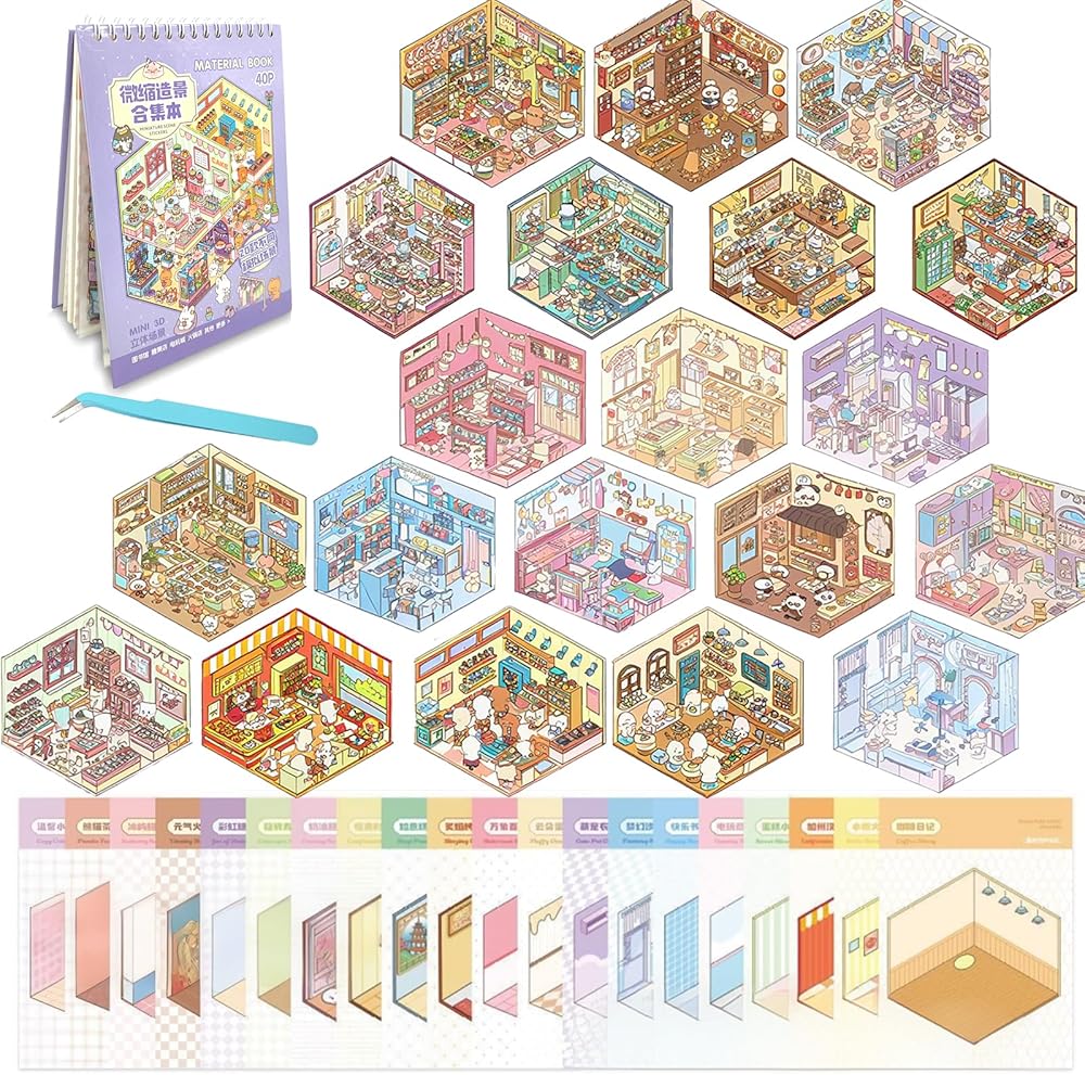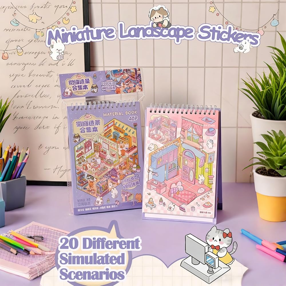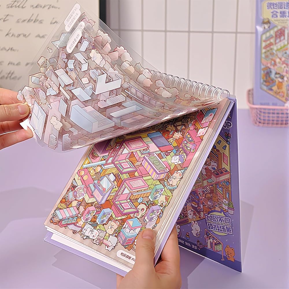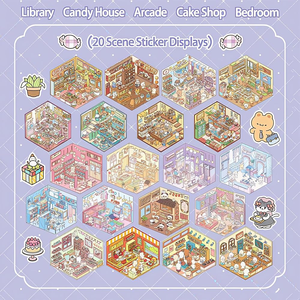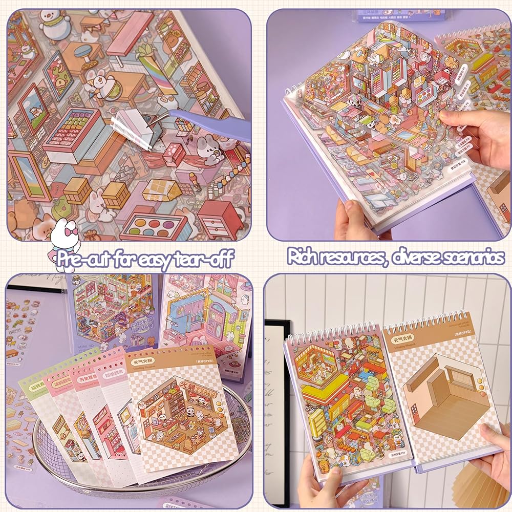 كتاب ملصقات المشهد ثلاثي الأبعاد للبالغين 20 مجموعة من الملصقات العلاجية لتخفيف التوتر وتمرير الوقت في المنزل DIY، المنزل السحري، ملصقات مشاهد المطاعم للأطفال لطيف على شكل حيوانات كرتونية